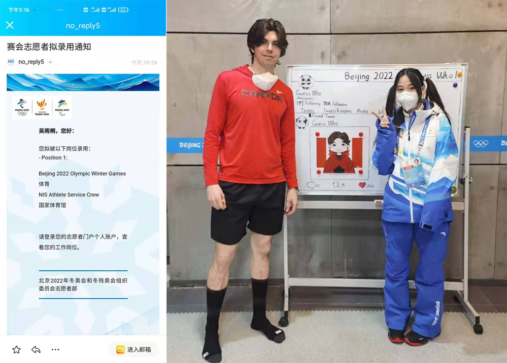 从初期全身心投入到冬奥会志愿者工作,连续工作30多天,从自我学习到岗前培训再到入场实战,吴雨桐同学不断提升自己的专业服务能力,虽然辛苦,但她觉得这是她最幸福、最快乐的时光。
