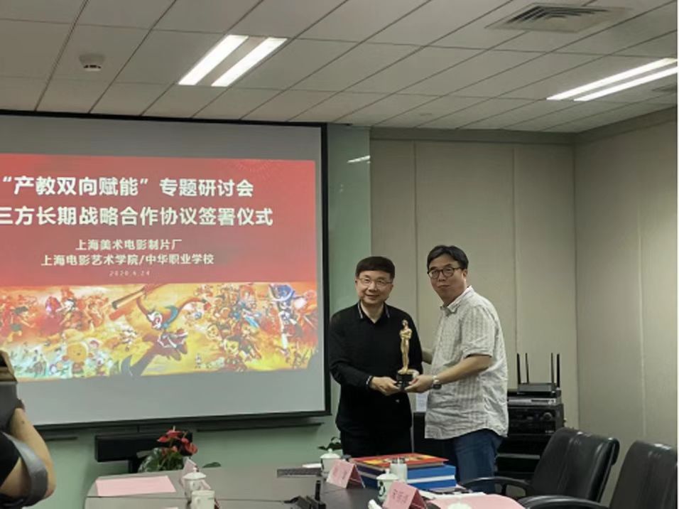 2020年6月24日下午,上海美术电影制片厂、上海电影艺术职业学院、中华职业学校“产教双向赋能”专题研讨会暨三方长期战略合作洽谈会在上海美术电影制片厂会议室内举行,美影厂王华强副厂长、上海电影艺术学院江泊院长、是科圣副院长、中华职业学校黄芸副校长等领导出席。上电数字娱乐中心主任包文君、演艺中心主任曲慧佳、视觉艺术中心主任顾平、影视制作中心主任许文君和专业负责人、教师代表等一起参加此次会议。