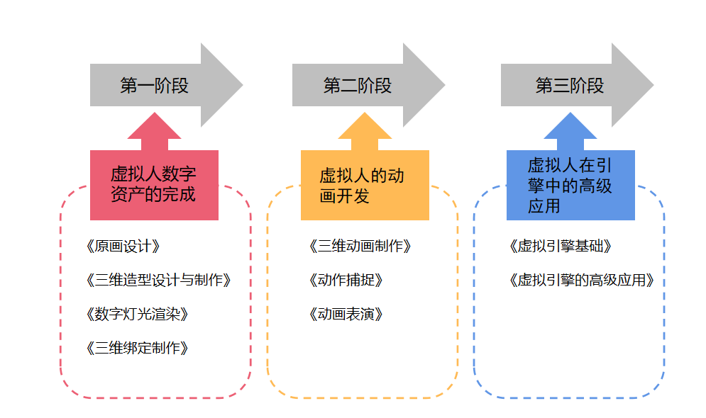 第一阶段教学目标为虚拟人数字资产的完成,所对应的课程包含《原画设计》《三维造型设计与制作》《数字灯光渲染》《三维绑定制作》;第二阶段的教学目标为虚拟人的动画开发,对应的课程为《三维动画制作》《动作捕捉》《动画表演》;第三阶段的教学目标为虚拟人在引擎中的高级应用,对应的课程为《虚拟引擎的应用》,这一阶段是技术难度最大的部分,需要运用光学动作捕捉技术进行实时动作的采集和处理,通过引擎和直播技术实现与线下观众的实时互动。