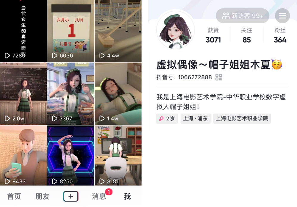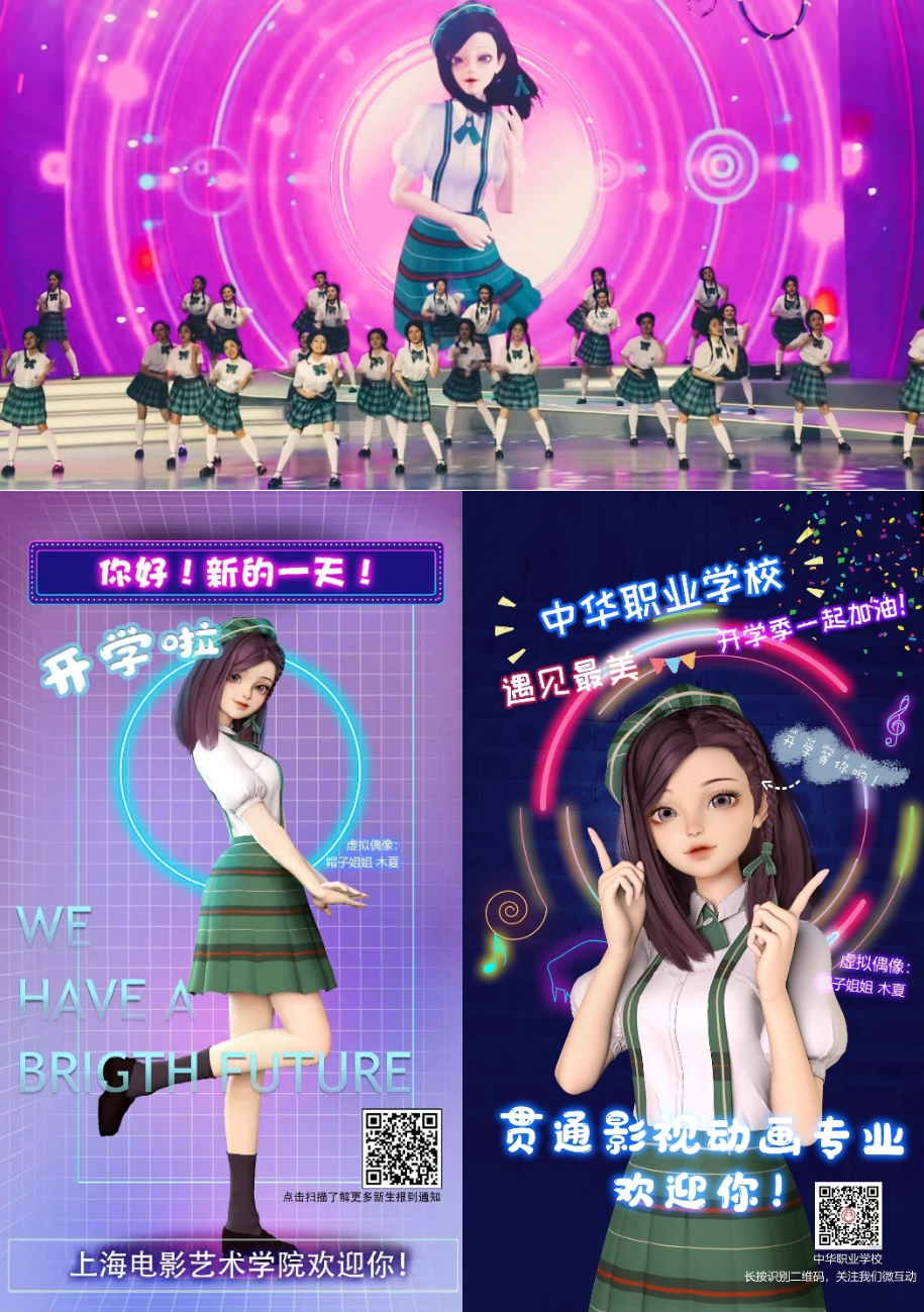 此外,数字虚拟人“木夏”作为虚拟偶像,已参与了上海电影艺术职业学院18周年教学成果展演活动、中华职业学校奖学金颁奖仪式、上海逸夫职业技术学校“艺波能量”展览会开幕式的演出。作为上海电影艺术职业学院的形象大使,“木夏”向全国观众做了线上直播活动。与此同时,“木夏”作为两校共同研发的成果,在“抖音”平台获取了一定量的粉丝和播放量。