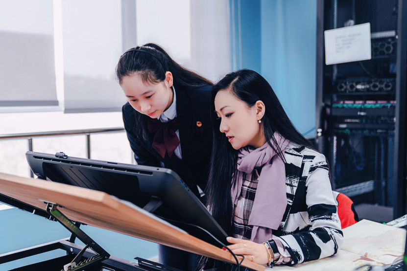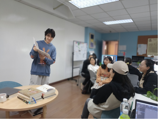 数字娱乐中心包文君主任指导学生、同学们通过项目交流学习工作室师生参与绘本项目制作中