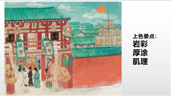 上色是非常严谨和追求艺术效果的设计过程,在上色前我们先进行岩彩风格绘画技巧的指导,让同学们了解到风格化的绘本如何来创作,并通过数码板绘的形式呈现具有千年历史的“岩彩画”风格。