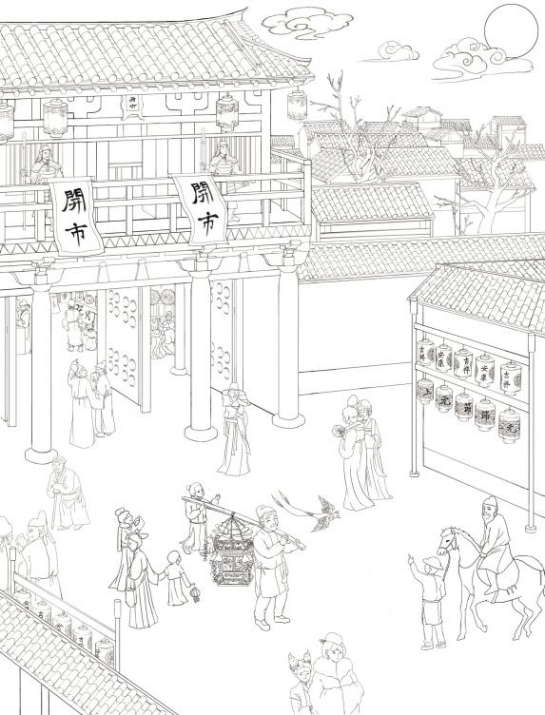 “小火鸟重新燃起希望,跟着匠人师徒出发了走出西市的坊门,走在(光德坊和延康坊)坊间的大街上,街道两边的坊墙已装点出节日的气氛”根据文字剧本分析文字,梳理出草图,描绘出画面的意境。草图的细化不是一遍而成,通过很多稿的调整,逐渐形成比较完善的,并达成人景结合构图和谐统一,画面氛围生活化和活动性结合统一,最终要达到行业的制作标准。