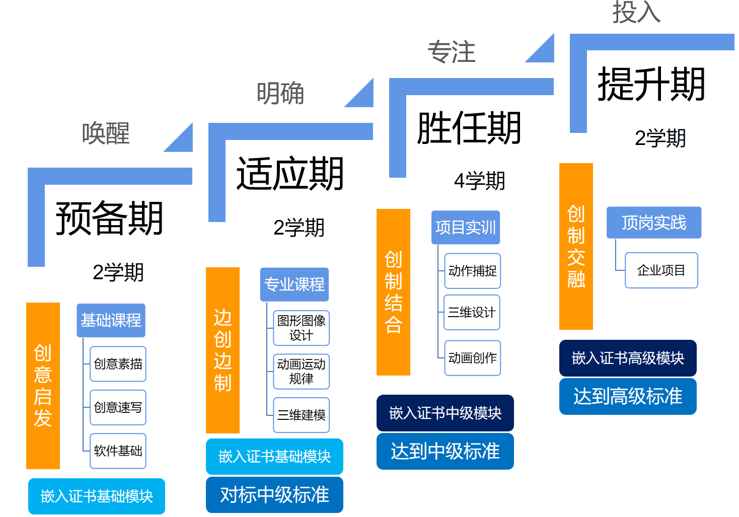 1+X证书制度的实施优化了人才培养模式,增进了学生与行业企业的联系,毕业生的适岗性更强。通过技能的交融、耦合产生创新效应,培养了用人单位所需要的复合型技术技能型人才。毕业生就业率连年提高,真正做到教学对接“新技术、新工艺、新规范和新要求”。通过1+X证书制度的建设和实施,专业群在培养方案、课程体系、教材编制、考核认证等方面都取得创新与突破。按照“唤醒、明确、专注、投入”四个梯度设计“制”“创”课程,把证书职业技能标准有序嵌入到十个学期的课程中,实现“制”“创”课程同步开设,帮助学生提早形成“创意、创新、创作”能力。