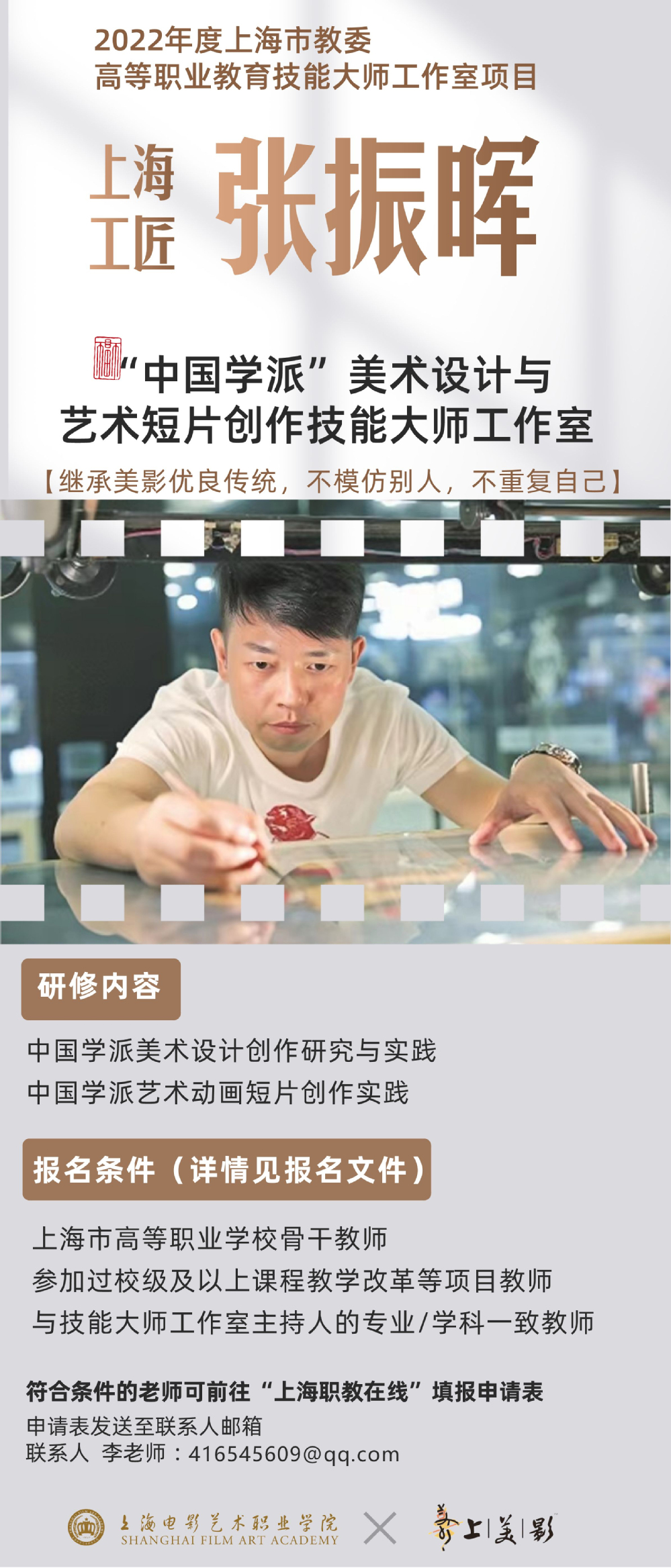 为打造上海职业教育高水平师资队伍,经研究,上海市教委启动上海市高等职业教育技能大师工作室立项建设工作(以下简称“大师工作室”)。经学校申报、专家评审、网上公示等程序,我院数字娱乐中心的“上海工匠”张振晖大师工作室入选2022年度上海市高等职业教育技能大师工作室建设项目。今日起进行报名工作,请各学校结合学校师资队伍建设工作、教师本人实际和发展需求进行推荐报名。
