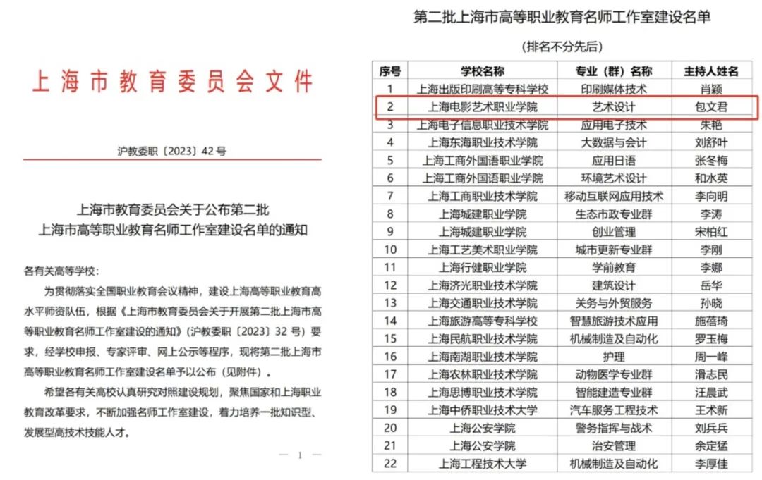 为贯彻落实全国职业教育会议精神,建设上海高等职业教育高水平师资队伍,上海市教育委员会开展了上海市高等职业教育名师工作室建设申报工作,公布了《第二批上海市高等职业教育名师工作室建设名单》。上海电影艺术职业学院数字学院院长包文君申报的“艺术设计名师工作室”成功入选。