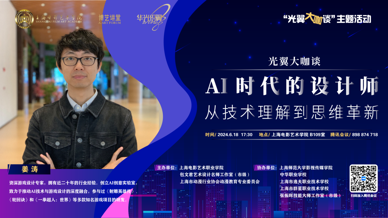 2024年6月18日,由上海电影艺术职业学院、上海市动漫行业协会动漫教育专业委员会以及包文君艺术设计名师工作室共同举办“光翼.大咖谈”活动,活动邀请到了拥有近二十年游戏行业经验的资深游戏设计专家——姜涛老师,为数字学院的老师和同学们带来了一场精彩的大咖分享:AI时代的设计师——从技术理解到思维革新。
