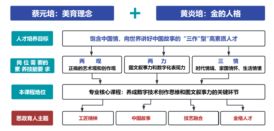 《数字化绘本创作》课程基于绘本行业数智(数字+人工智能)化转型需求,紧密结合上海建设全球动漫游戏原创中心的目标,深入传承黄炎培职业教育思想,注重学生的人格养成,指引学生根据岗位所需的两观(正确的艺术观和创作观)、两力(图文叙事力和数智化表现力)、三情(时代情境、家国情怀、生活情愫),培养能向世界讲好中国故事的创作、制作、运作“三作”型高素质人才,填补中国原创绘本市场的空白。