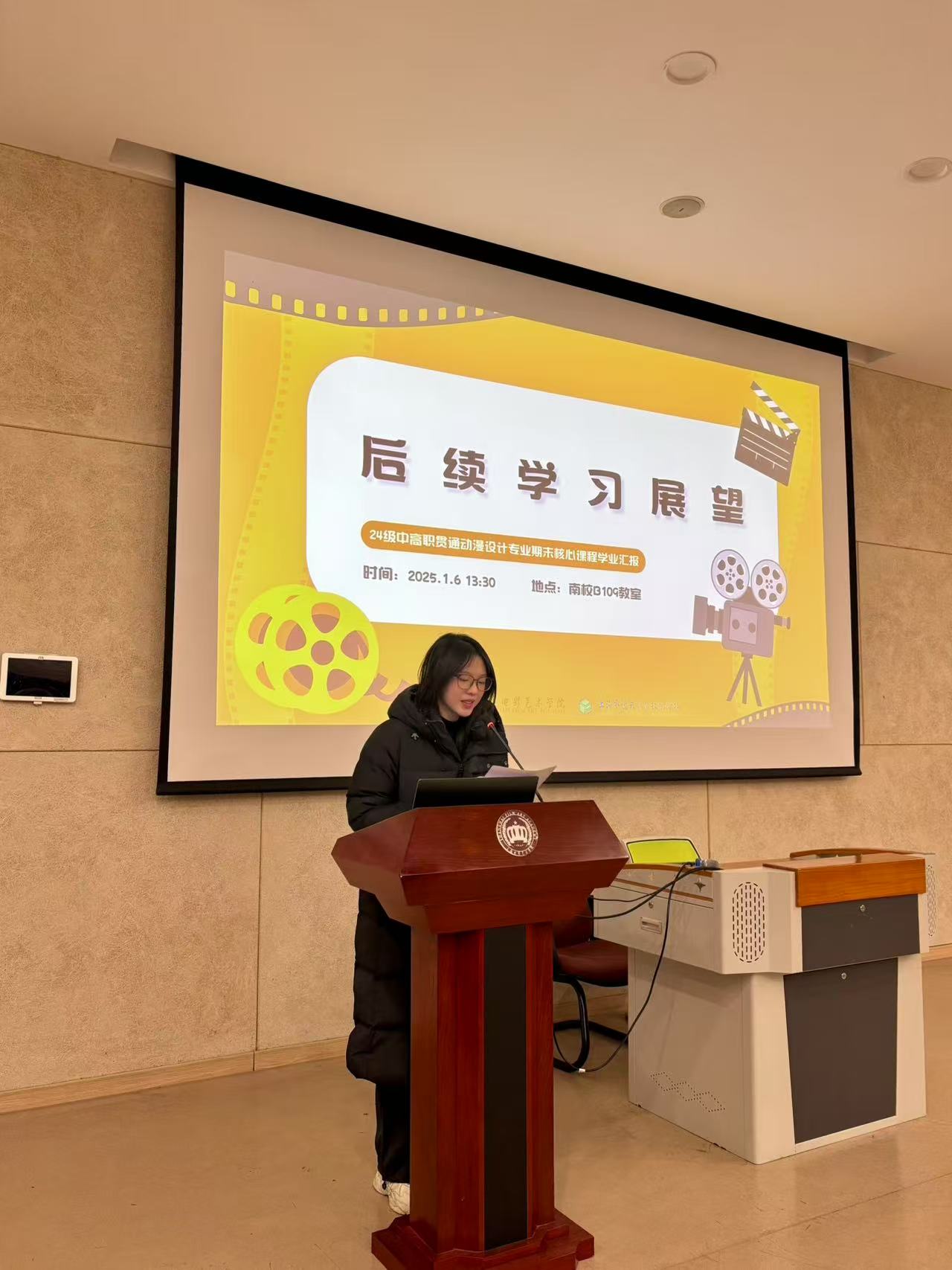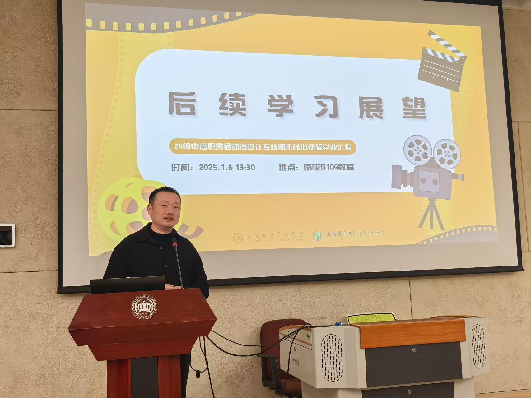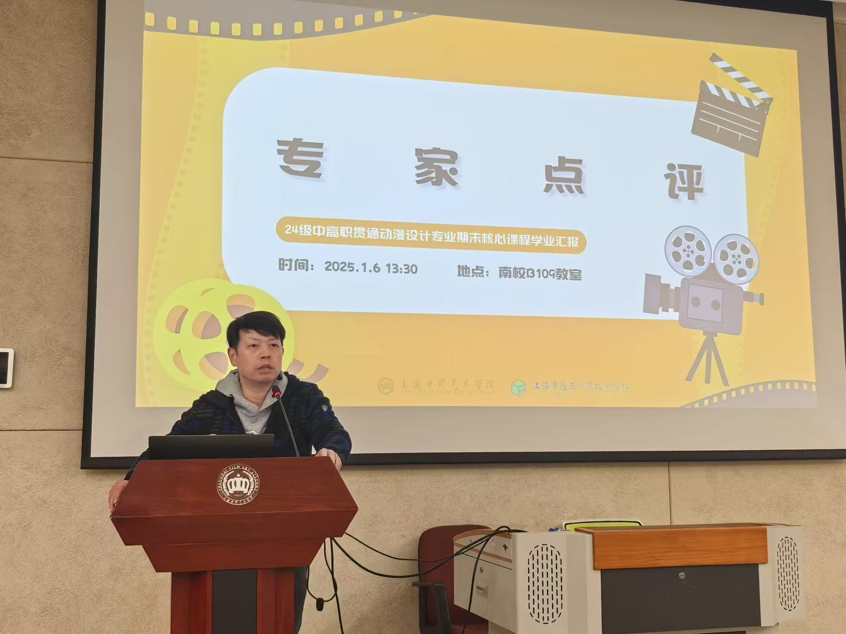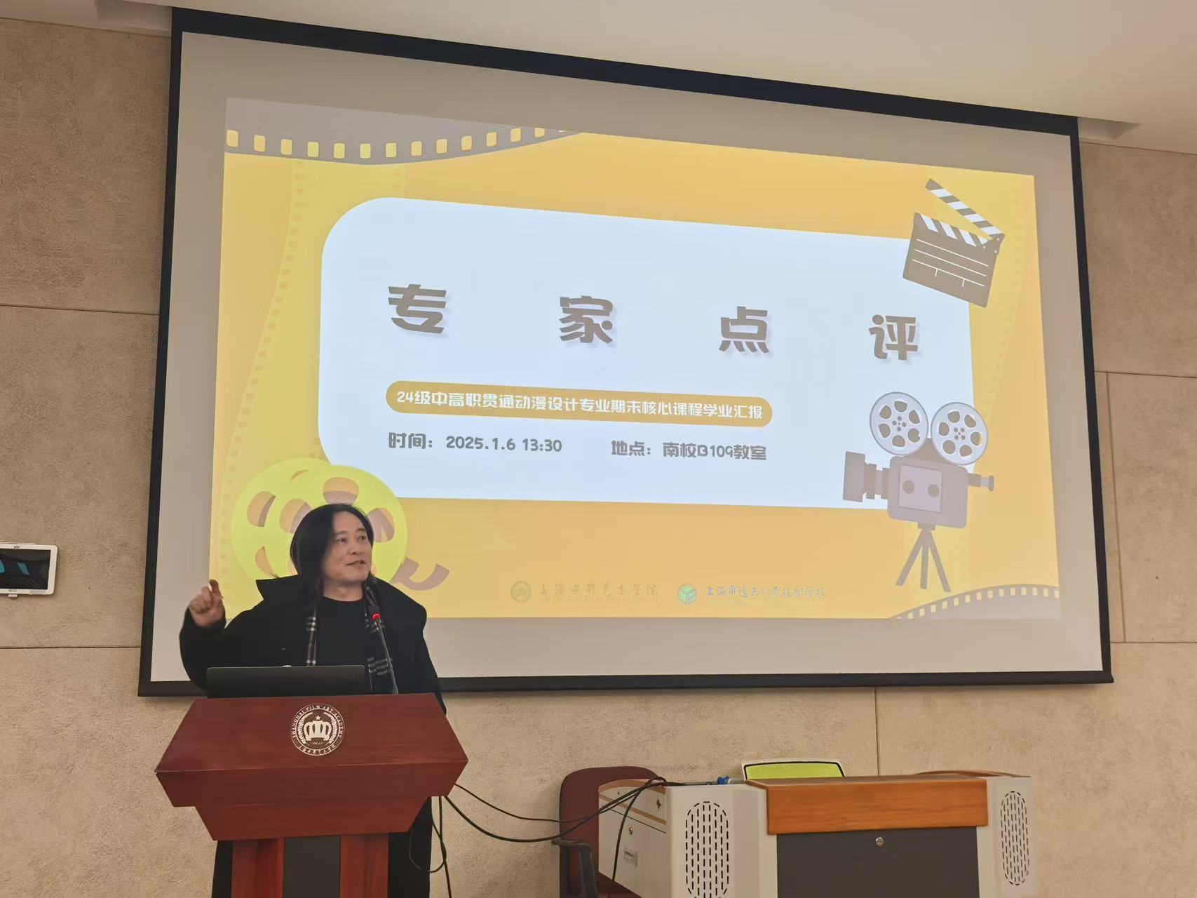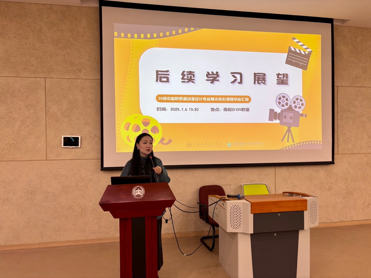 25年1月6日上午,上海电影艺术职业学院B109教室迎来了一场别具一格的汇报——“动漫融汇,艺海扬帆”24级中高职贯通动漫设计专业期末核心课程学业汇报。著名漫画家慕容引刀老师、上海市逸夫职业技术学校校长助理许彦杰、专业与教学管理处副主任曹纲、动漫设计专业负责人杨艳、专业教师童铮,上海电影艺术学院数字学院院长包文君、原上海美术电影制片厂导演张振晖以及绘本工作室负责人查筱菲齐聚一堂,共同见证同学们的成长与蜕变。本次活动由史芷钰同学主持。