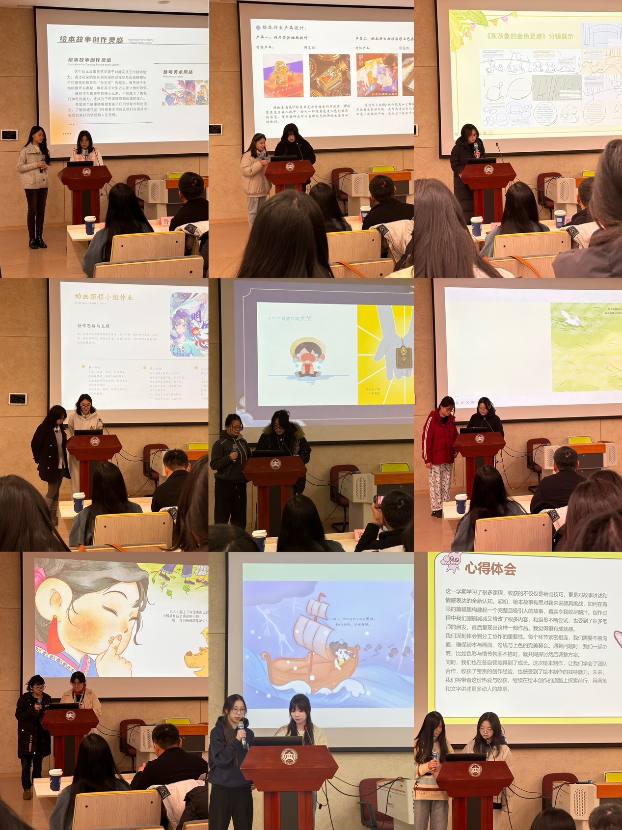 核心课程学业汇报现场,同学们自信地展示着自己在课程中的成果。利用数字化创作手段,通过团队协作,在一个学期的时间内创制的精美绘本以及一部部创意十足的短片,无不凝聚着同学们的创意与汗水。与上次汇报相比,作品的成熟度有了显著提升,充分体现出同学们在高职新的学习阶段的积极探索与不懈努力,勇攀专业高峰。
