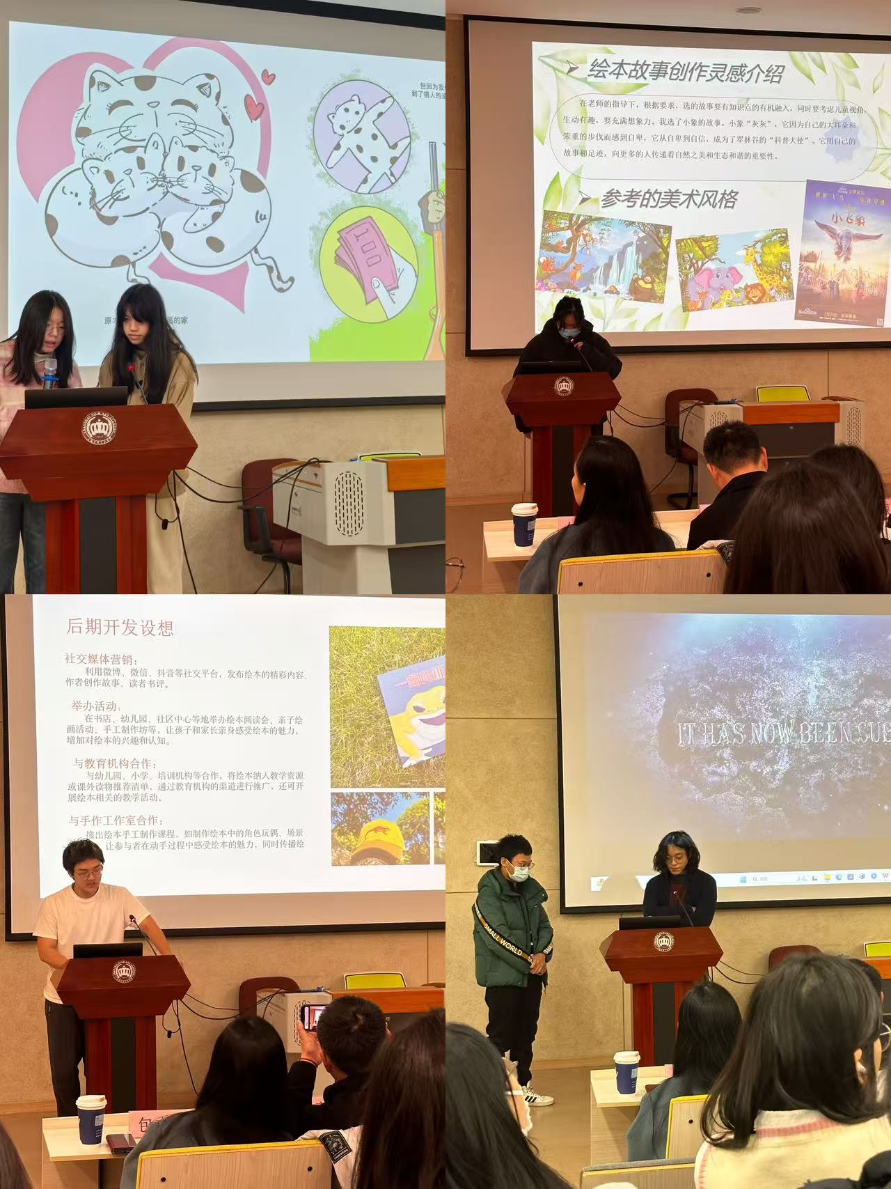 本学期,同学们在高职老师们的指导下完成了《数字化绘本创作》、《商业项目实践》、《三维造型设计与制作》、《品牌管理与IP授权》和《新媒体动画》五门专业课程。汇报会上,大家重点展示了《数字化绘本创作》与《商业项目实践》两门课程的成果,作品全方位呈现了同学们从高中阶段过渡到电影学院后的学业进步与专业成长,犹如破茧成蝶,焕然一新。