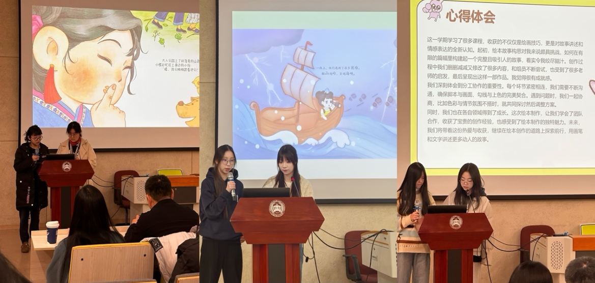 课程结束后,一场别具一格的汇报——“动漫融汇,艺海扬帆”在多功能汇报厅展开。同学们自信地展示着自己利用数字化创作手段,通过团队协作,在一个学期的时间内创制的精美绘本。著名漫画家慕容引刀老师和上海工匠张振晖老师对作品进行了专业点评。慕容老师对同学们的坚持给予高度评价,他动情地说:“当你尽你所能完成一本作品时,你就是作品。”他深知创作之路的艰难,同学们在过程中虽或有放弃念头,但最终坚持下来,这十分不易,值得称赞。张振晖老师也肯定了同学们绘本形式与风格的多样性,并向大家提出建议:要明确绘本受众,在创作时需考虑不同年龄段儿童的心理需求,精准定位,让作品更具感染力。两位专家的点评为同学们未来创作指明了方向,提供了宝贵经验,犹如灯塔照亮前行之路。