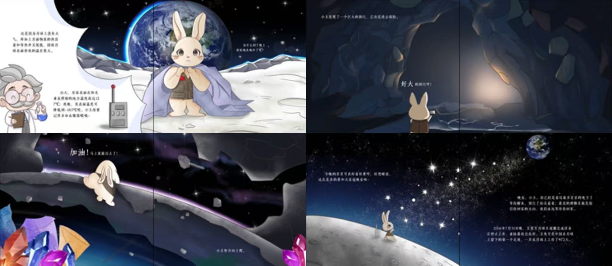 姐姐玉玉和兔兔的日记,(也就是玉兔一号和玉兔二号探索回的月球照片)让小玉对月球产生了浓厚的兴趣,在科学家的帮助下小玉成功登上月球。(小玉象征玉兔三号),它有着聪明的大脑和勇敢的心。在月球上跳来跳去,探索着未知的宇宙。它采集碎石碎片,用绳子和铁桶将探索到的东西运回地球,为人类传递着科学的希望和梦想。却在探索中出现意外,隔断了与地球的连线,最终对讲机电量耗尽,它被留在了月球……