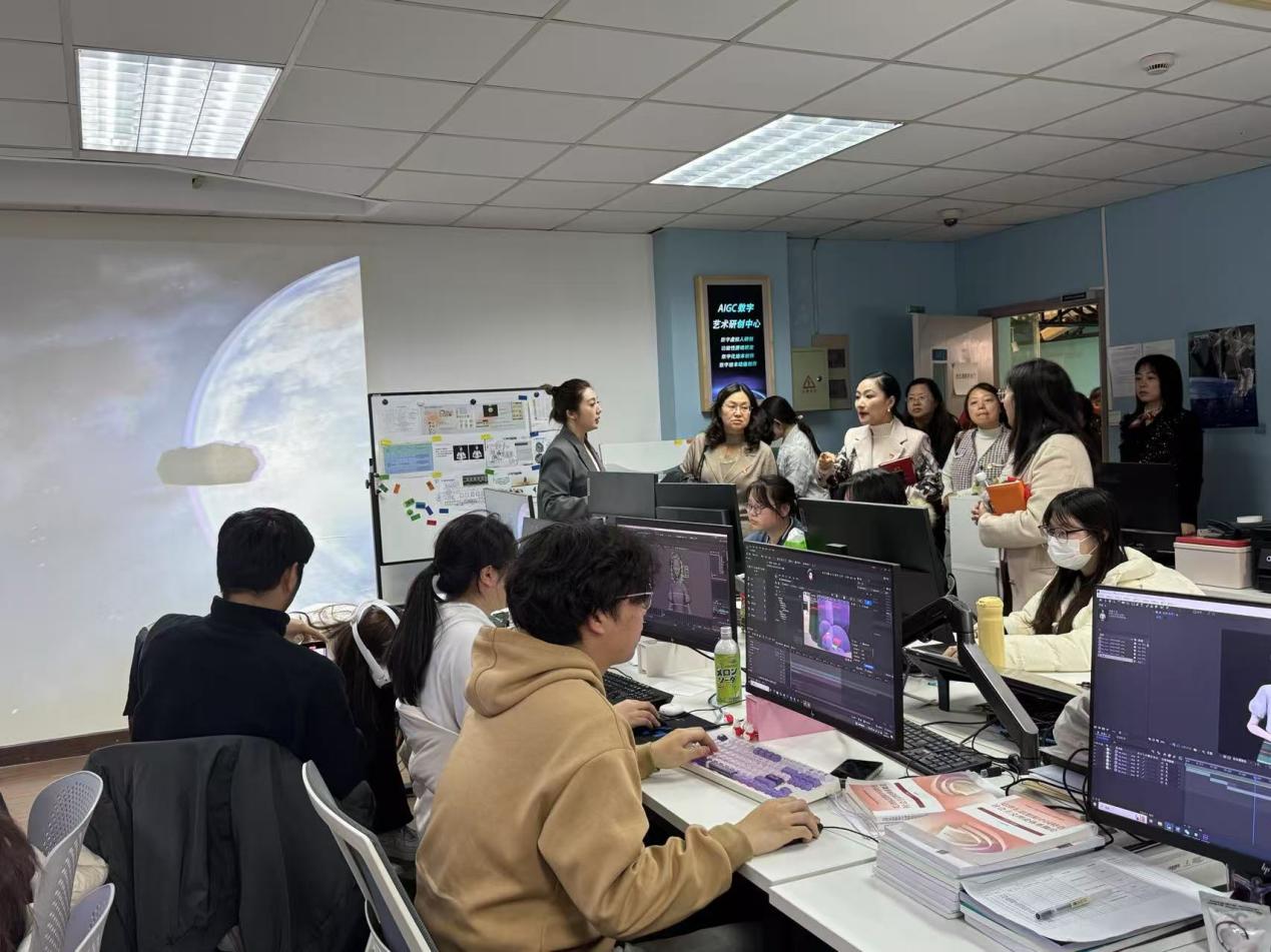 研讨会结束后,数字学院包院长、高书记和老师们陪同来访的老师们走进AIGC数字艺术研创中心、虚拟拍摄、动作捕捉、文创直播、多媒体灯光及动画游戏等实训室进行了参观。