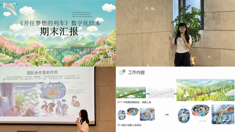 走进数字化绘本《开往梦想的列车》创作的奇妙世界,通过项目组杨小萌、高尔蔓、戴璐怡、汪雯婧、詹雁翎、江天、沈悦等同学们的介绍,一幅幅精美的画面与动人的故事展现在大家眼前,为大家了解中国乡村振兴事业的新篇章!这个学期的时间里同学们学会了怎样配合好团队进行流程化的工作,如何运用手绘板和手绘屏,在老师的指点下也认识到了画面的不足之处和改进方式。