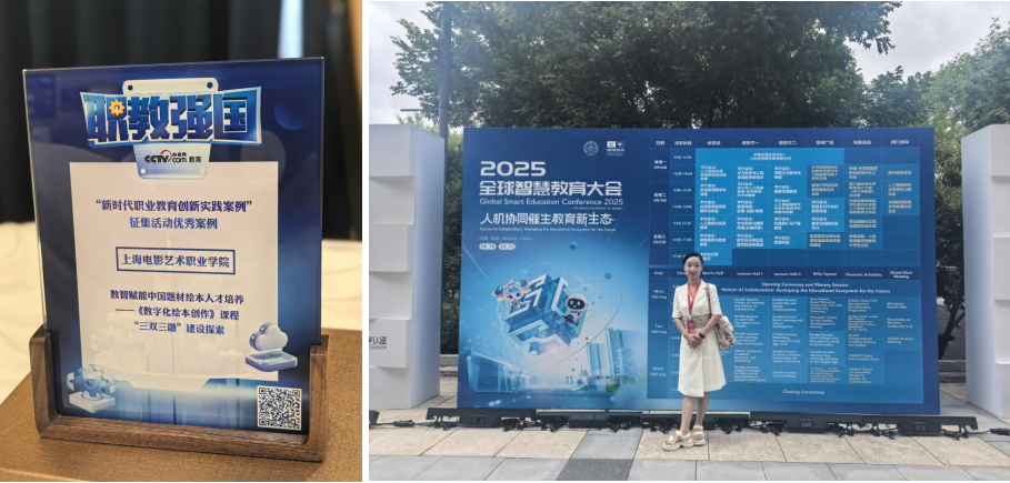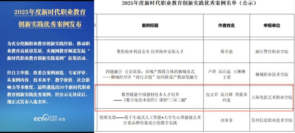 为深入挖掘职业教育创新实践经验,推动职业教育迈向高质量发展新征程,央视网发起 “新时代职业教育创新实践案例” 征集活动。经过严格遴选,上海电影艺术职业学院数字学院选送的《数智赋能中国题材绘本人才培养 ——<数字化绘本创作> 课程 “三双三融” 建设探索》案例成功入选。数字学院院长包文君在随后举行的2025年全球智慧教育大会“职业教育数字化转型” 论坛上代表学校获颁证书,并接受央视网采访,系统介绍了学校在数智赋能职业教育中的实践成果。