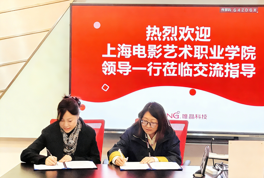 图2 上海电影艺术职业学院党总支副书记吕旻与唯晶科技人力资源部运营总监李凤签署战略合作协议