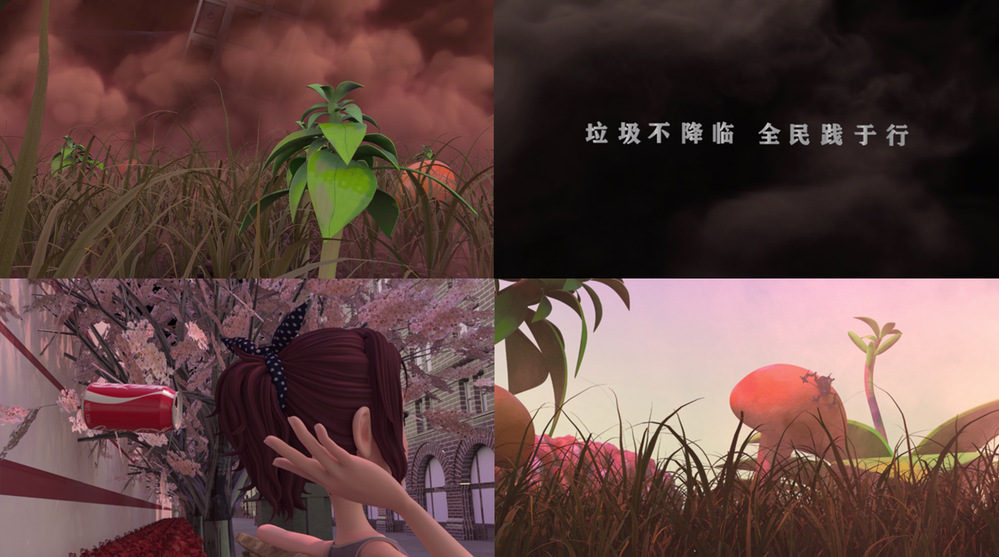 作品《丢弃瞬间》以全CG制作方式讲述主人公随手丢弃可乐瓶后对环境影响的故事。学生将可乐瓶丢弃的瞬间进行夸张手法表现:将可乐瓶臆想成飞船,垃圾释放的有害物质臆想成外星生物,由此展开故事并引出垃圾不降临,全民践于行的公益主题。