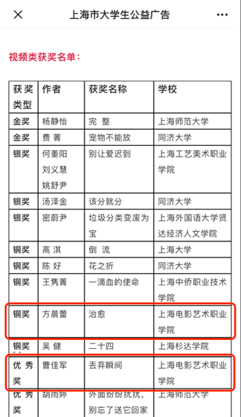 影视多媒体技术专业在专业建设中把各类比赛融入课程教学要求中,2019年底组织专业师生参加第六届上海市大学生公益广告大赛,19中高特效班方晨蕾小组的《治愈》和18特效班曹佳军小组的《丢弃瞬间》经过层层筛选,于2020年分别获得了视频类的铜奖和优秀奖。此次参赛的两部作品为专业课程作业,参赛学生将《影视分镜脚本设计与制作》、《摄影摄像》、《影视前期视效预览》、《影视三维造型设计与制作》、《影视三维动画设计与制作》、《数字合成技术》、《影视特效技术》等多门课程教学知识点应用于短片制作中。