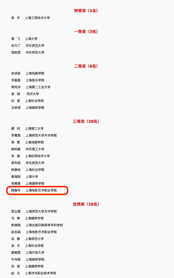 “上海高校艺术与设计类青年教师教学竞赛”由上海市教育工会、上海市艺术教育委员会共同主办,本次竞赛以“创新未来”为主题,以审美和人文素养培养为核心,以创新能力培育为重点,旨在引导艺术类和设计类专业教师不断优化课程体系和教学内容,培养造就教育情怀深厚、专业基础扎实、勇于创新教学、善于综合育人的教师,从而着力发展高素质专业化创新型艺术教育,提升上海高校艺术与设计类青年教师的综合素养、专业水平和创新实践能力。本次竞赛结果为特等奖1名,一等奖3名,二等奖6名,三等奖10名,优秀奖10名。