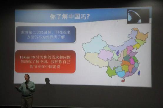 讲座一开始,乔治首先向大家介绍了新媒体,随后他介绍了电子商务“电子商务是FaxianTv最主要的来源,当然广告数和订阅量也不可或缺”乔治说到,他希望FaXianTV的节目政策能让广大人民群众从一个固定点才能看到的电视节目到随时随地都能看到。目前,FaXianTV在市场上是独一无二的,没有任何直接的竞争,它给用户提供了一个全方面了解中国的体验。对于中国的媒介,乔治提出了三个最有代表性的的新媒体——优酷、土豆和搜狐,他和同学们分享了新媒体竞争的当前态势以及对未来的思考。