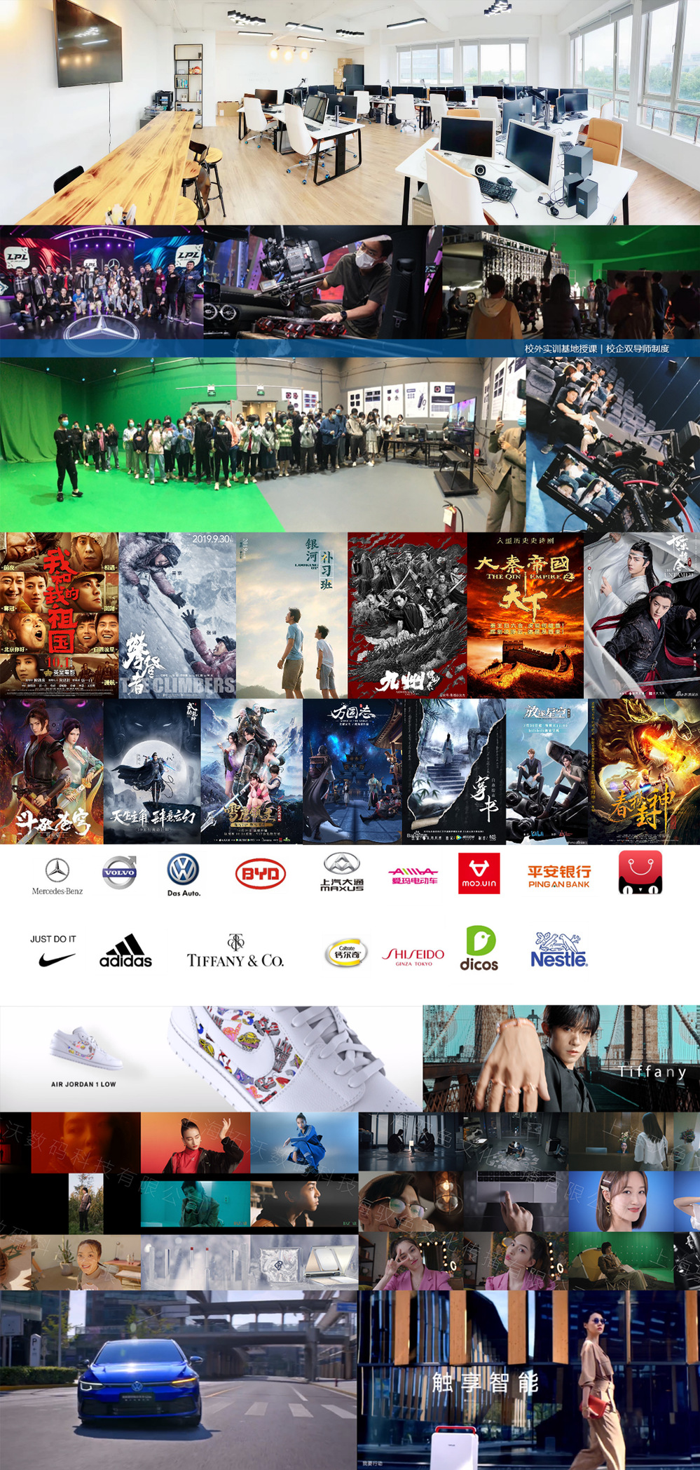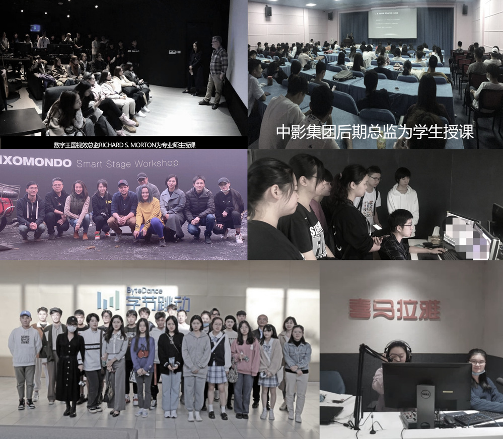 影视科创学院在教学过程中注重产教融合的发展理念,引入国际影视制片标准开展教学,依托学院下设编创工作室、制片工作室、影视新媒体工作室、映时代中期工作室、壹点视效工作室、影视后期工作室、影视调色工作室、数字合成工作室和虚拟制作技术工作室,提供了与行业一线环境相匹配的制作条件。通过这些工作室,学生能够在真实项目中实践,提升实战能力。其中在虚拟制作方向,学生也可以在虚拟环境中进行场景搭建、角色创建和特效制作,从而提升影视作品的视觉效果和生产效率。多年来也参与制作影视作品几十余部,包括院线电影、影视剧商业广告、综艺节目等。