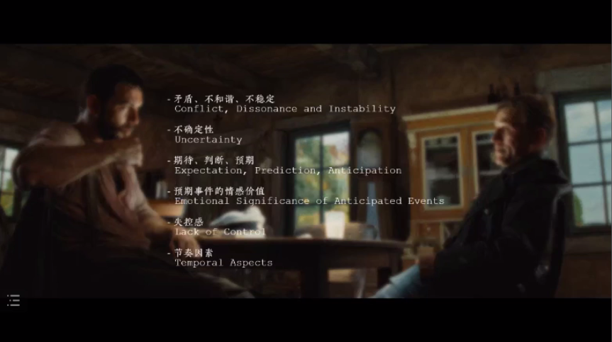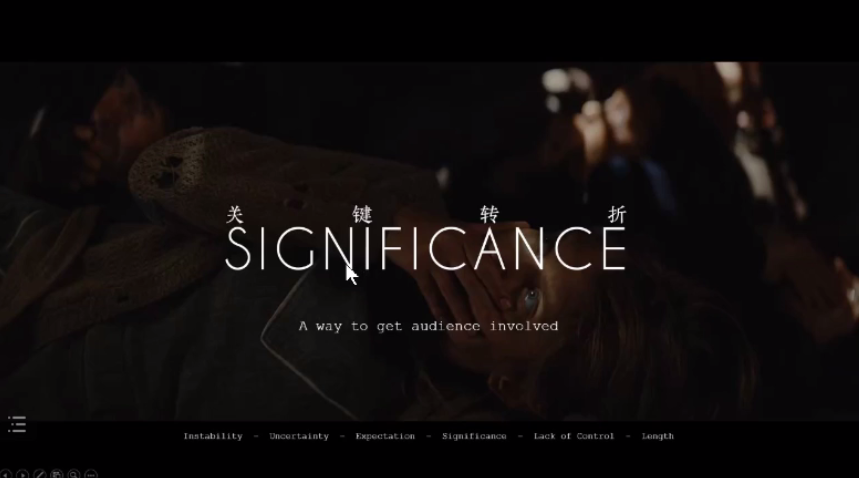 然后,陆老师分析过程中提到了运用视觉、情节、角色以及镜头等电影元素来表现紧张感。陆地老师讲到六个促成紧张感的元素,在电影当中都能够唤起观众不同程度的紧张感。在同学们后续学习和创作过程中,将“六元素”并配合画面反复交替出现,从而让作品能够引起观众的兴趣点与注意力。