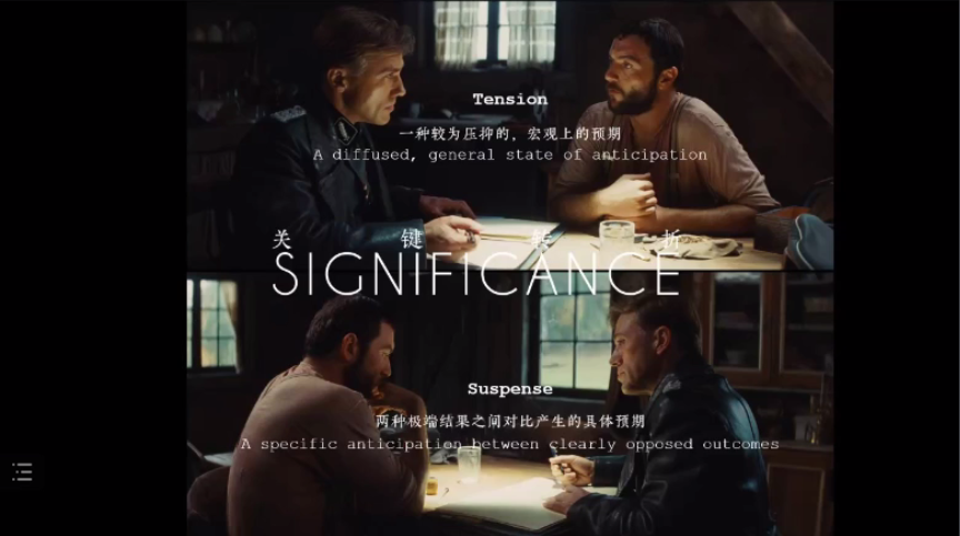 接着陆老师通过对特殊镜头的详细解析,让同学们了解紧张感在不同画面的表现下也是有区别和等级的。 例如将“bomb under the table”即“桌子下的炸弹”概念引入影片镜头的创作中时,可以给予观众足够的刺激,让故事情节更加跌宕起伏。同时,陆老师提醒同学们在未来的学习中会不断地遇到这个概念,在编创的过程中,可以去借鉴这样的手法进行创作。