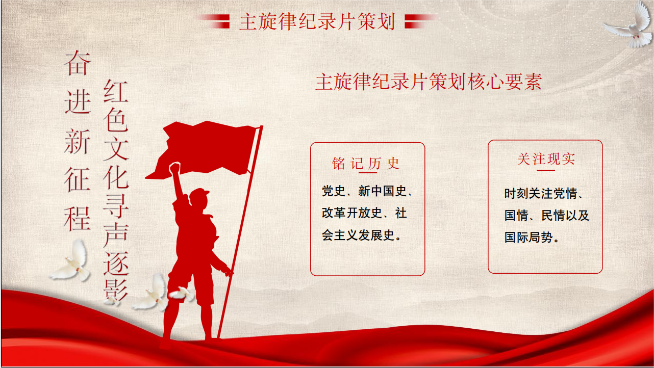 主旋律纪录片策划的核心要素有两个:一是铭记历史,可以讲党史、新中国史、改革开放史、社会主义发展史;二是关注现实,时刻关注党情、国情、民情以及国际形势。选题要继承红色文化基因,抓社会主义核心价值观的根基,一个优秀的主题是纪录片能赢得观众注意力的重要因素。
