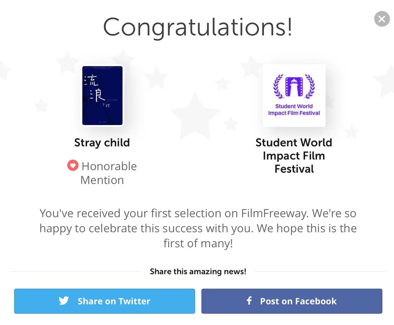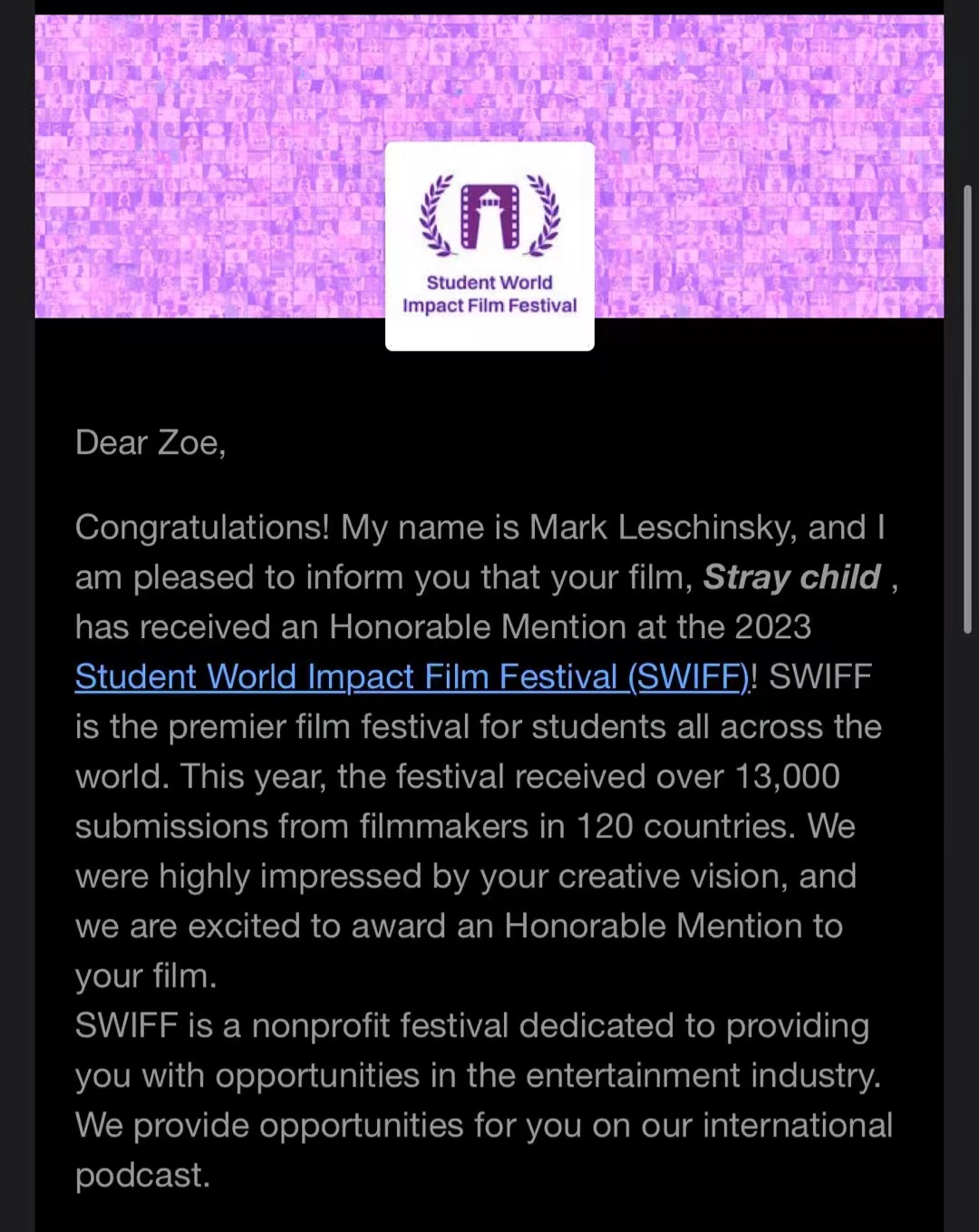 “学生世界影响力电影节Student World Impact Film Festival(SWIFF)”是世界上最大的学生电影节之一、是第一个世界各地学生的电影节。SWIFF今年收到了120多个国家、13000多位电影人的投稿,SWIFF专注于年轻讲故事者,让他们有机会与世界分享他们的故事。