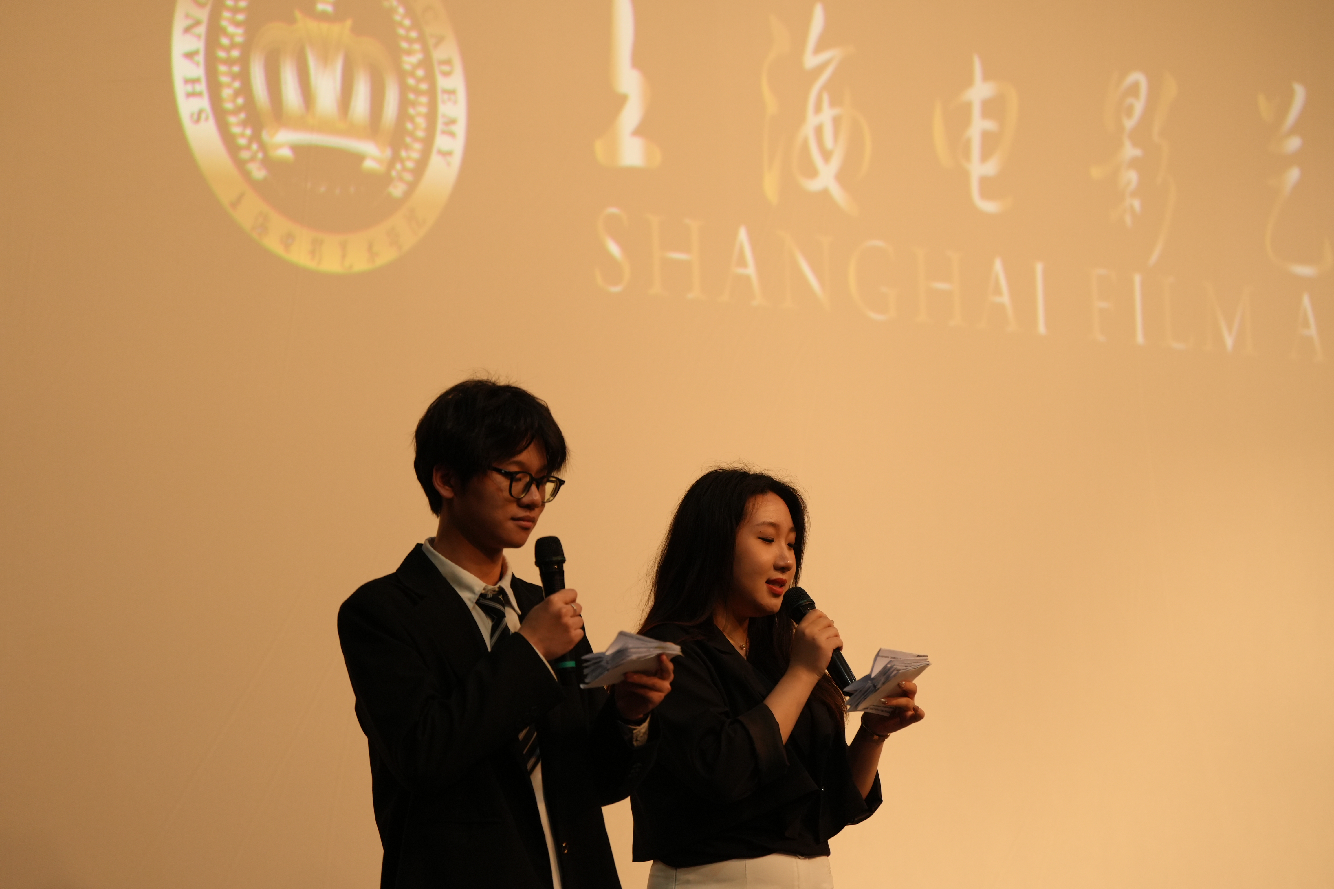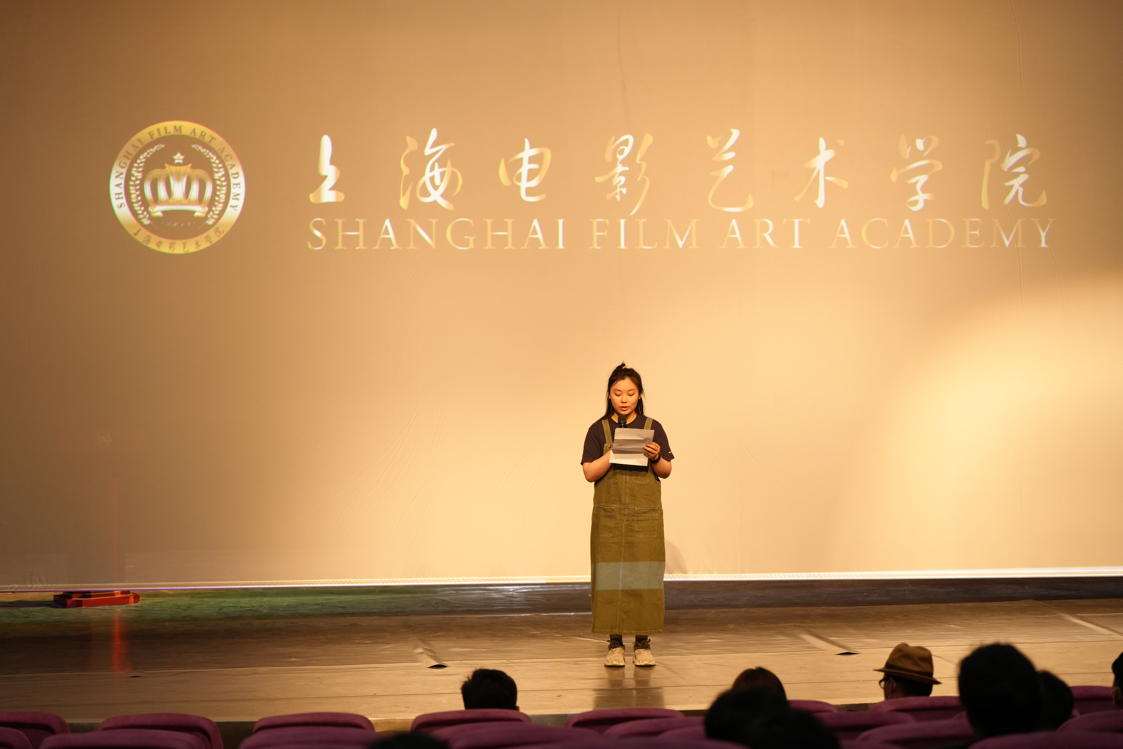 在两位主持人的宣布下,展映正式开始。根据2023届各个毕业生的毕业创作短片类型,将各位同学的短片分为了故事片单元《冬日的光》和《买妈妈》,微短剧单元《伊家人》和《自由的她们》,纪录片单元部分《旭韵丹心》和《聲》,以及视效专业的《星航回忆录》和《重生》。