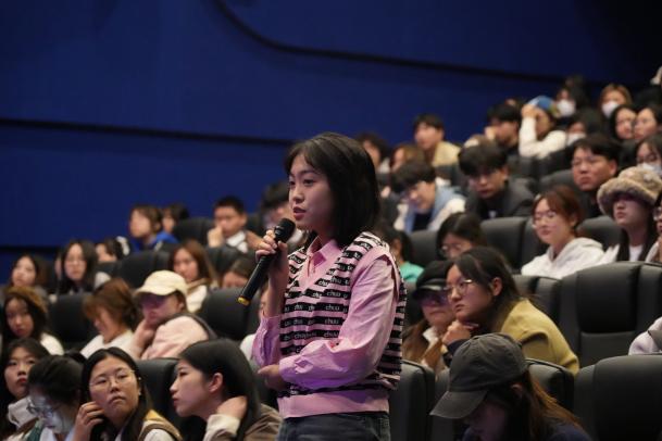 放映结束后,多部短片主创导演与带队老师登台,与同学们分享创作心得,我校学生踊跃发言,与各位主创探讨影片画面技巧手法和情节创作的经验,现场学习氛围浓厚。各位主创耐心细致的回答为在座同学们分享了许多实用的拍摄实践干货、提供了更多元的表达方式,同学们开拓眼界的同时,也认知到了探索电影创作的无限可能。