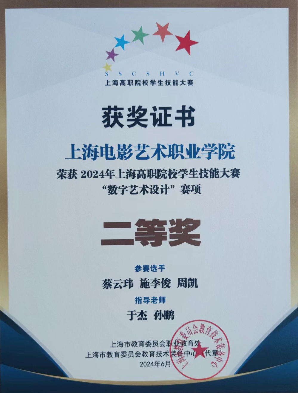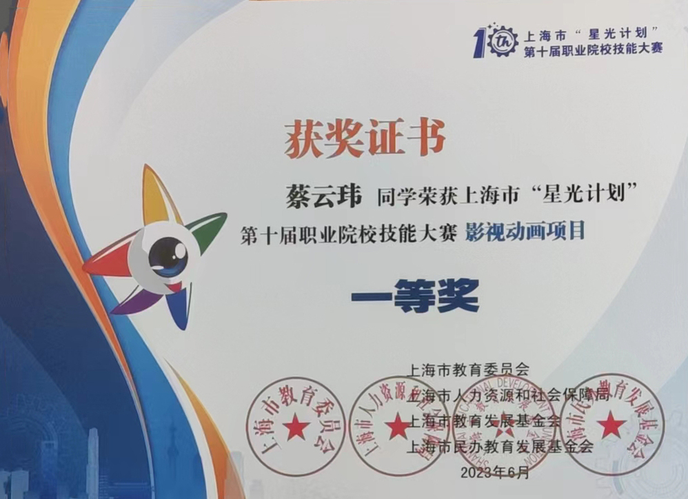 蔡云玮同学在课堂中的学习是一段不断探索和挑战自我的旅程。从专业基础到核心课程,他以对艺术和技术的深刻理解,展现了自己对这一领域的独到见解。他的成绩不仅优异,更在理解的深度和广度上超越了同龄人。他对动画制作的每一个细节都充满好奇,从角色设计到三维技术,从故事叙述到视觉表现,他都力求精进,不断追求更高的艺术境界。为了更好的提升自己的实战水平和经验,他积极参加各类竞赛。每一次竞赛,对他来说都是一次学习和成长的机会。他总是能够从每一次的竞赛经历中吸取经验,不断优化自己的创作方法,提升自己的专业技能。2023年6月,他荣获上海市“星光计划”第十届职业院校技能大赛影视动画项目一等奖,这一荣誉不仅是对他专业技能的肯定,更是对他专业精神的认可。