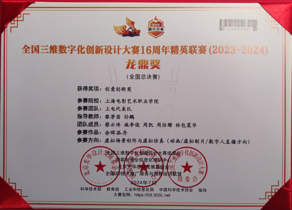 在7月13日于湖北美术学院璀璨落幕的全国3D大赛16周年精英联赛(2023-2024)“虚拟场景创作与虚拟仿真(动画/虚拟制片/数字人直播方向)”专项赛龙鼎大奖争夺赛中,影视科创学院影视多媒体技术专业的师生团队凭借卓越的创新力与技术实力,以作品《余晖孤舟》脱颖而出,荣获全国总决赛一等奖的殊荣。