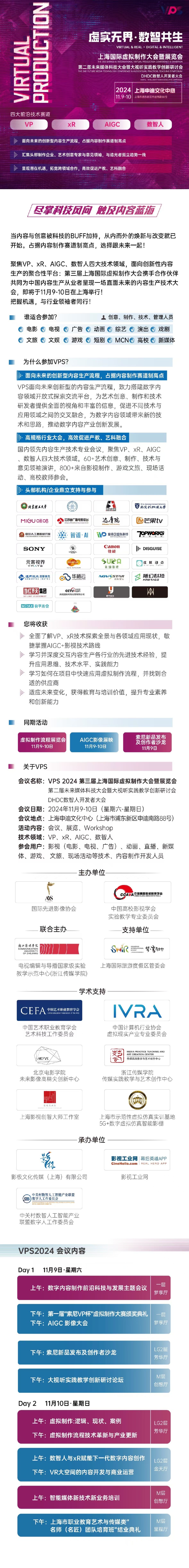 本届VPS2024,力图通过推进以虚拟制作、AIGC等为代表的数字内容技术应用拓展、实践教学模式落地,深度展现技术效能与领域延展,实现技术与应用、艺术与科技、产业与教育的充分链接。数字内容产业蕴藏着巨大的价值潜能。VPS2024以全景式解构数字内容生产与运营方面的技术革新和落地走向,分享前瞻趋势的同时将虚拟制作、AIGC、XR及数字人技术有机串联,展示最新技术创新与实操进展,探讨技术应用机遇与挑战、商业经验与产业趋势,与国内外虚拟制作、AIGC等领域的权威机构、技术专家、杰出企业、先锋团队共同推动中国数字内容技术应用发展,积极赋能中国数字内容产业快速推进与先锋技术优秀经验的推广和普及。