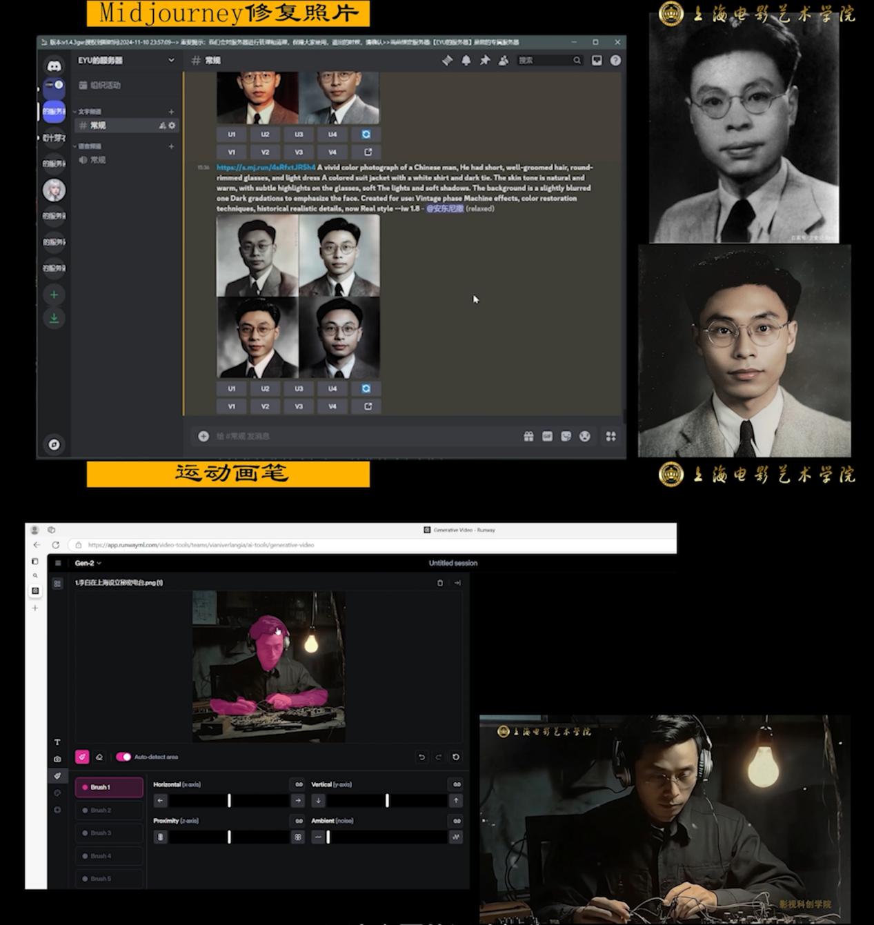 短片通过AI技术,将那些泛黄、静止的老照片赋予新的生命,让它们在现代科技的推动下“活”起来。师生团队在短片制作过程中,将AIGC技术工具Midjourney和Runway进行综合运用,实现老照片从静态到动态的完美跨越。使用Midjourney生成一系列与老照片相似的动态帧并上色,随后将这些动态帧导入Runway中进行视频编辑和特效处理。通过Runway的抠像、风格迁移等功能,可以进一步丰富动态化的效果。最后,将Runway生成的视频处理后合成,并利用AI匹配声音制作出一段完整的视频。