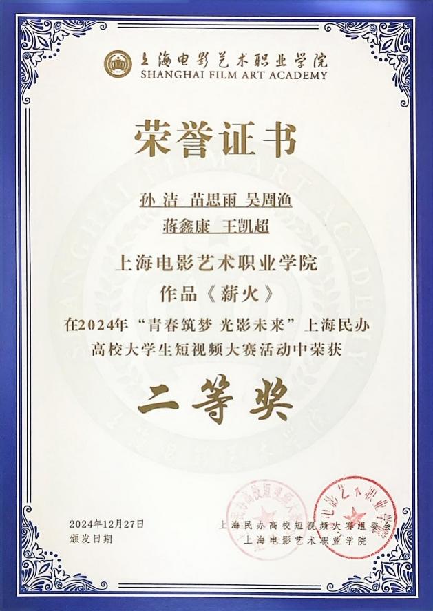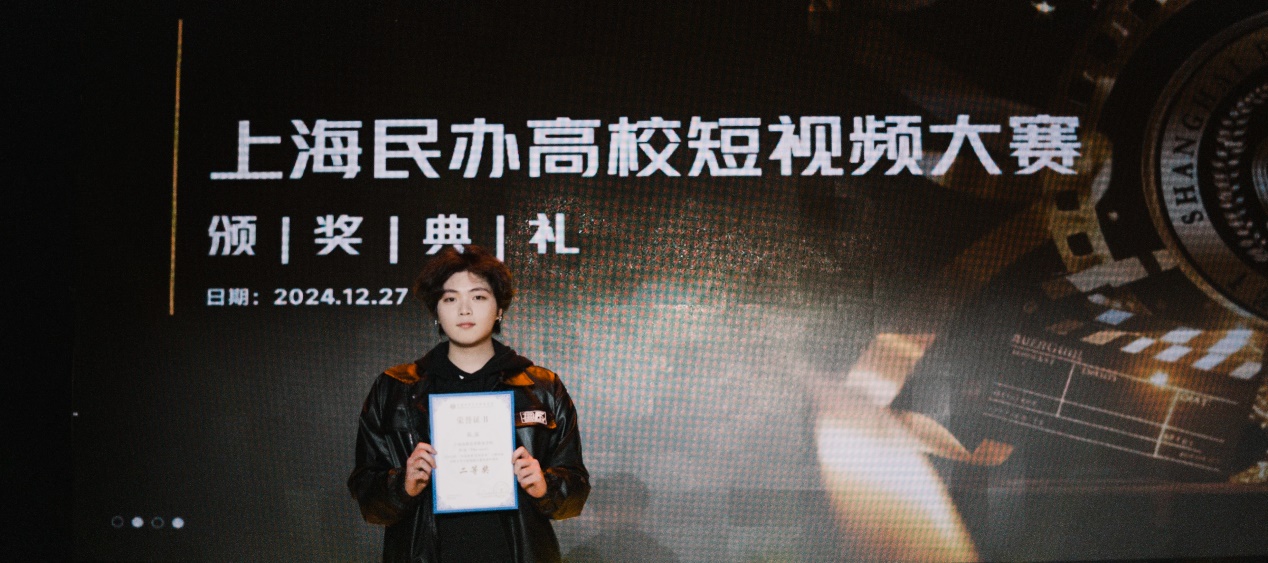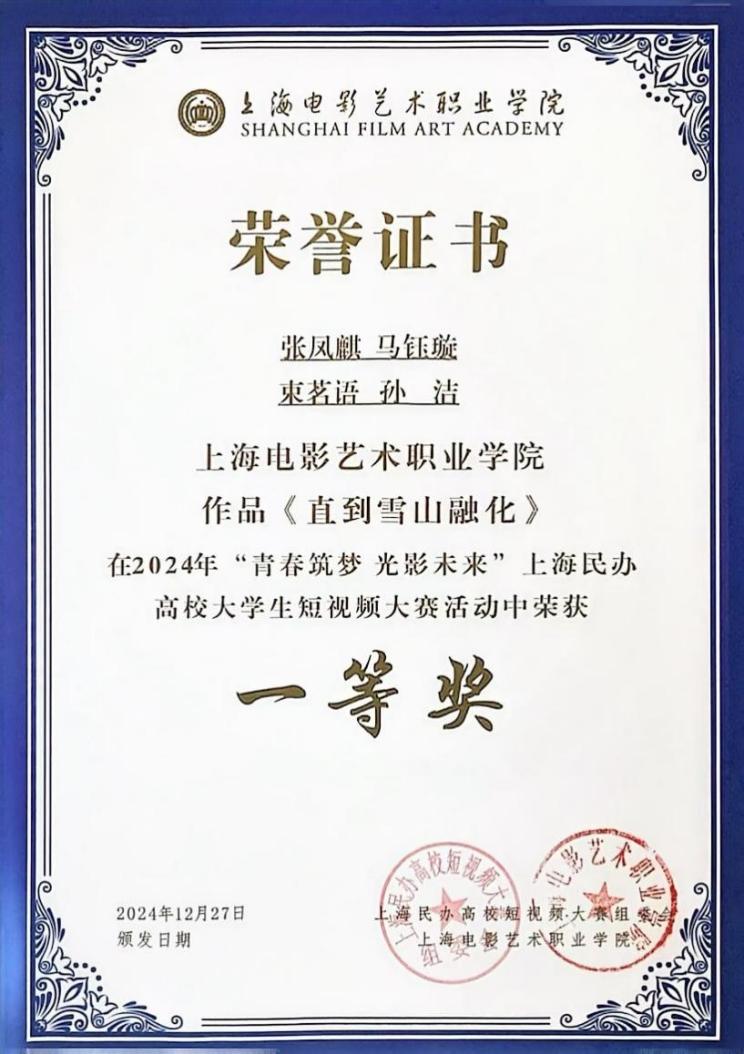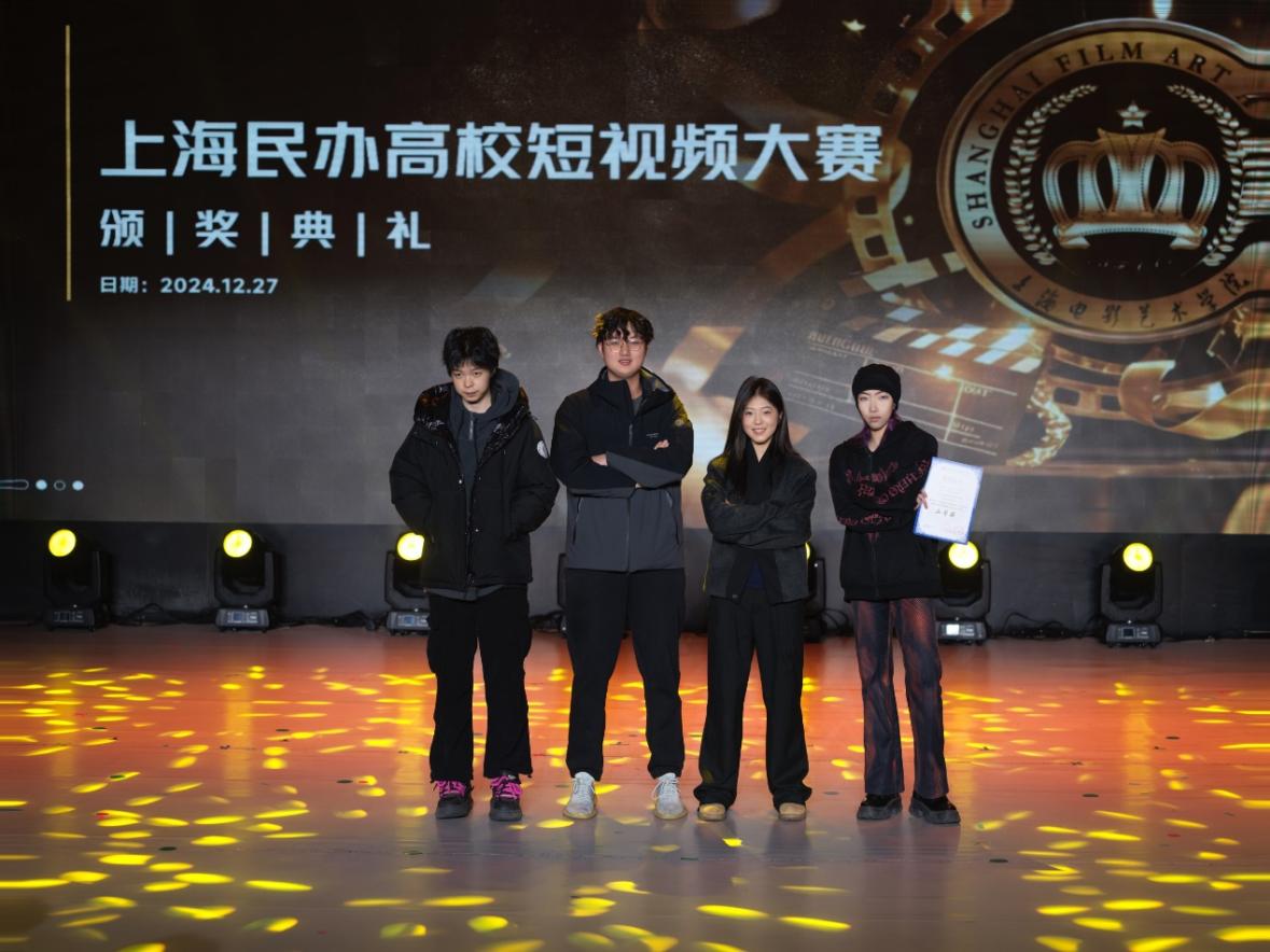 2024年12月7日,上海民办高校短视频大赛颁奖典礼在上海海艺影城隆重举行。摄影摄像技术专业多个学生团队脱颖而出,成绩斐然。其中,《直到雪山融化》团队的张凤麒、束茗语、马钰璇和孙洁同学获得一等奖,展现了过硬的专业技术与团队协作能力。