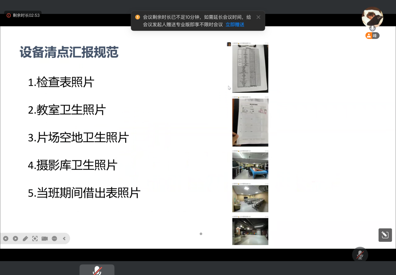 此后,摄影库及灯光库库长们对各库新库管进行线上培训,培训主要内容为库房器材检查注意事项;片场卫生检查注意事项;虚拟拍摄实验室器材安全及卫生检查注意事项。两库库长们认真梳理了库房器材检查的关键环节和易忽视点,并结合个人积累多年的查库实践经验,制定了更为详尽的培训计划。