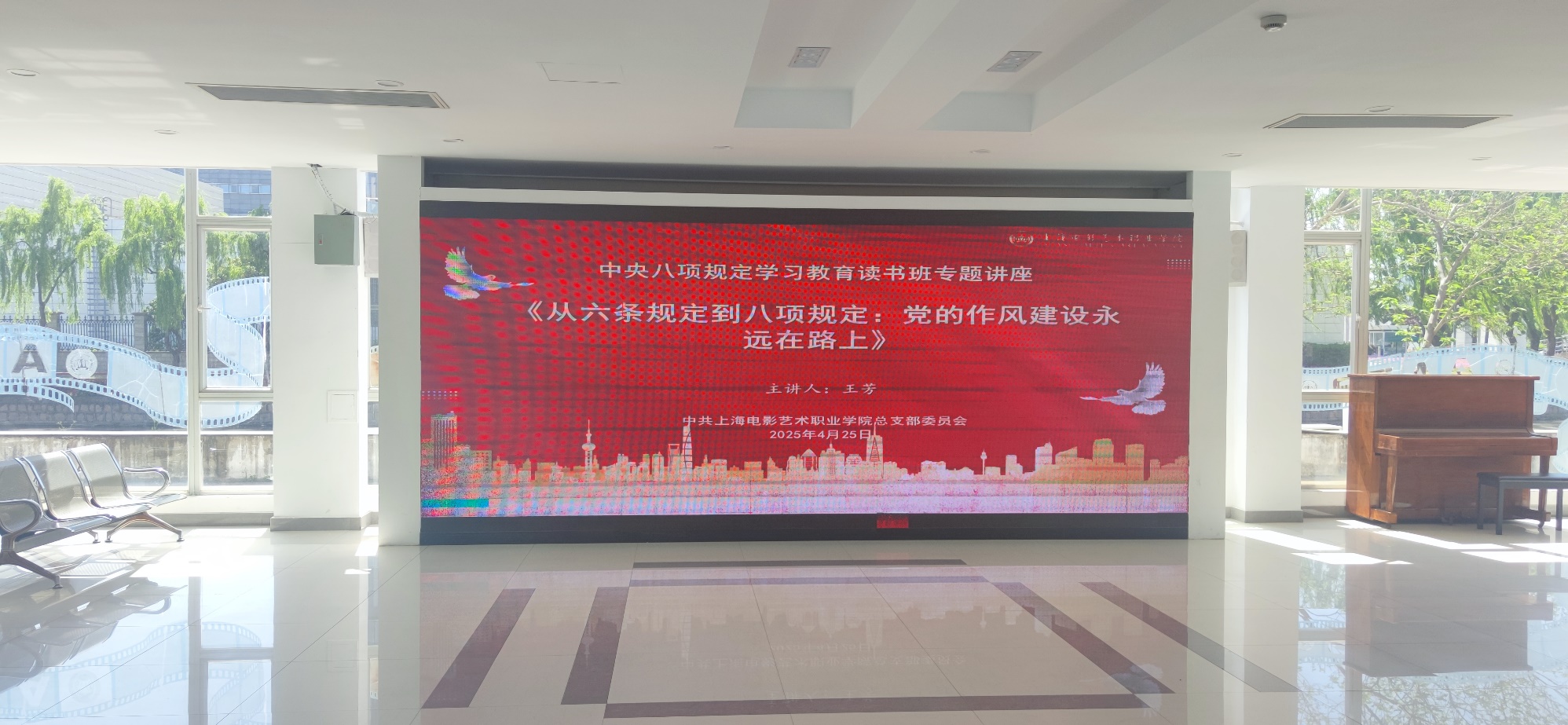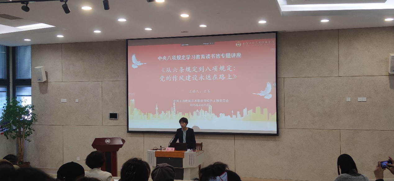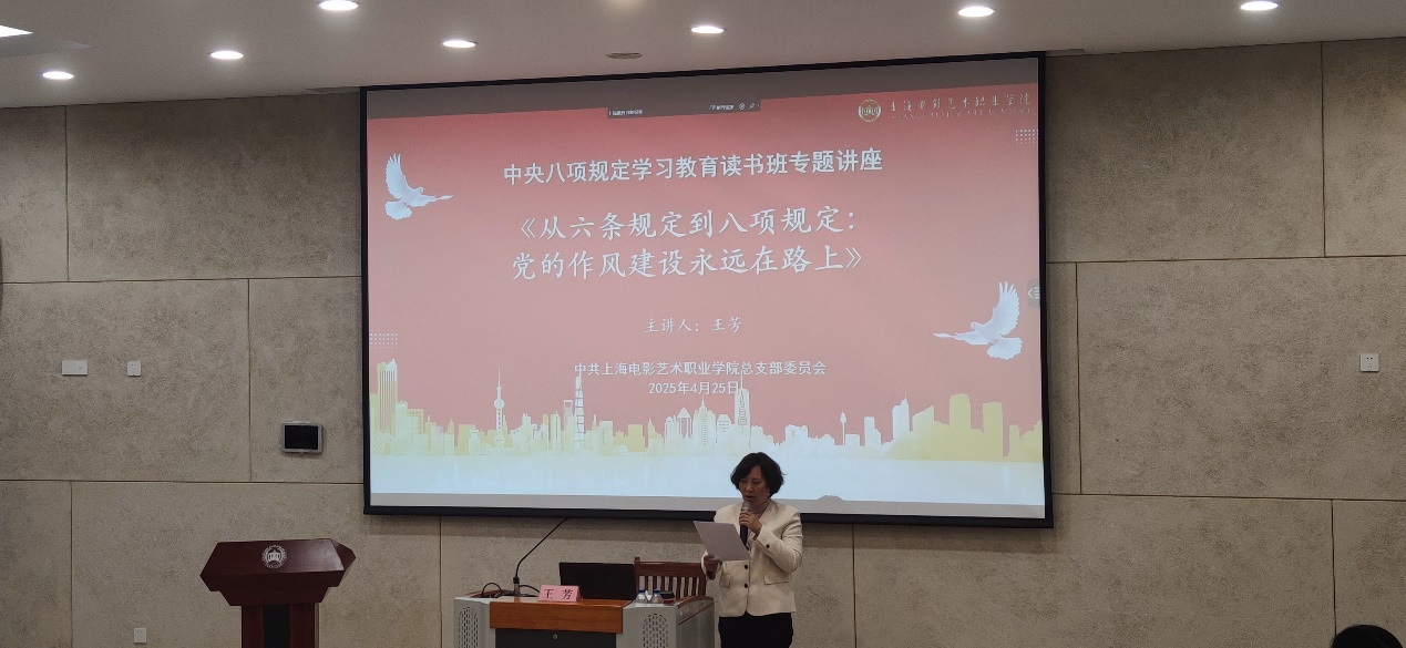 2025年4月26日,为深入学习贯彻党的作风建设要求,影视科创学院党支部组织全体党员、预备党员及中层干部,参加由上海电影艺术职业学院总支部委员会精心策划的中央八项规定学习教育读书班专题讲座。讲座以《从六条规定到八项规定:党的作风建设永远在路上》为主题,旨在通过系统学习,增强党员干部的纪律意识和责任担当,推动学院作风建设迈上新台阶。