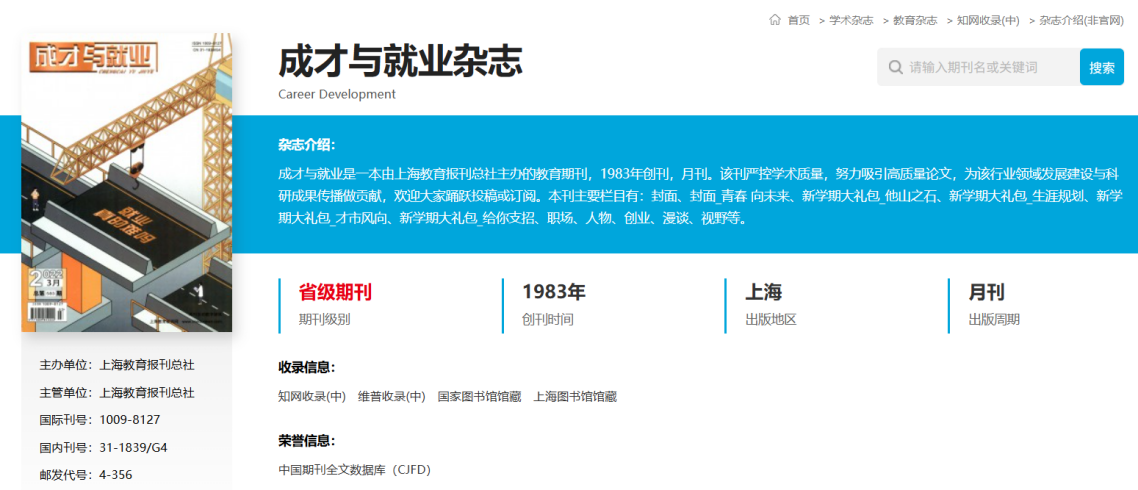 《成才与就业》是由上海教育报刊总社主办的期刊。杂志创刊于1983年,办刊以来,融指导性、实用性、知识性于一体,发行周期为:月刊,经过杂志社调整,不断提高 刊物的整体质量,在行业内有一定的影响。