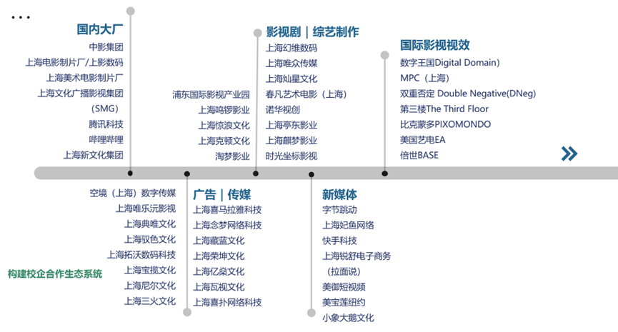 专业依托上海市高水平专业群,遵循校企双导师培养原则,建有国内外优秀名师名导合作教学平台,与多个国内大厂以及影视剧综艺制作、广告传媒、新媒体等行业知名企业联合共建校企合作教育系统。