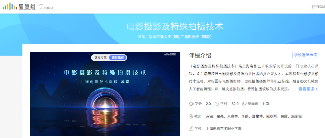 摄影摄像技术专业对标国际影视工业标准,依托产教融合经验,联合校外合作企业打造的特色核心在线开放课程《电影摄影及特殊拍摄技术》经上海市教育委员会评审正式入选2024年上海市精品在线课程,目前于 “智慧树”平台全面开放选课通道。