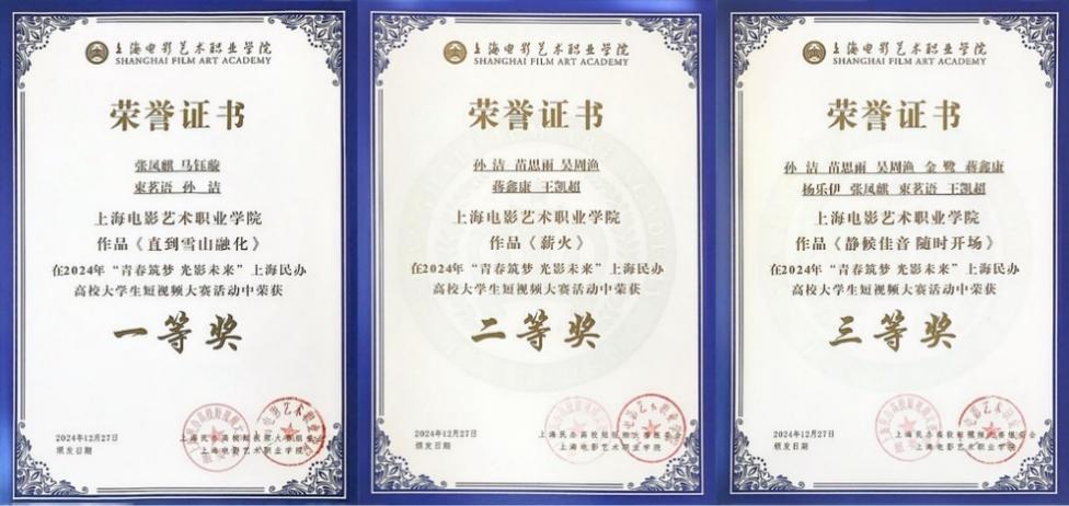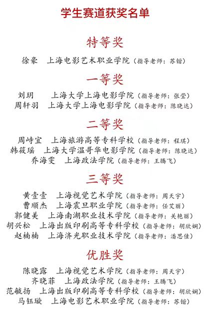 专业学生多次在教育部白名单赛事中国好创意暨全国数字艺术设计大赛中荣获国家级,省部级一二三等奖。在与上海市博硕本学生同台竞技的上海市文化影视科技职业技能大赛中荣获唯一特等奖。在上海民办高校短视频大赛中收获一二三等奖。摄影摄像技术专业学生影像作品多次被国内媒体杂志等选用。除此以外,我校摄影摄像技术专业在跨文化人才培养领域取得里程碑式突破,专业学生在全国复旦社杯职业院校英语配音大赛中获得特等奖。