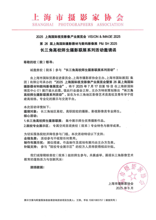 本次活动作为2025上海国际视觉影像产业展览会系列活动之一,“向新而行——长三角高校青年师生影像作品联展系列活动”将于展览会同期推出。展览以影像为媒,汇聚青年才智,响应“以美育人、以文化人”的时代倡议,为文化强国注入活力。向“新”而行,是技术与艺术的融合。面对AI、新材料等革新,摄影已超越传统。本次联展聚焦“新影像、新技术、新材料”,集结长三角16所院校师生的前沿探索,展现青年创作者在技术浪潮中的艺术坐标与跨学科创新。