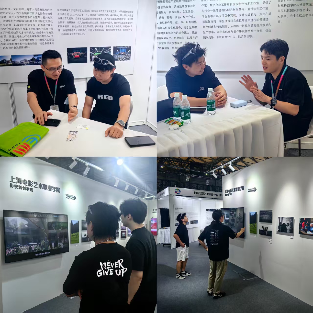 学院选派23级摄影摄像技术高本班沈元峰与22级中期班张昊渊两位优秀学生代表全程驻展。他们系统地向与会观众阐释了学院的专业特色定位、创新人才培养模式及实践教学体系建设成果。通过结合自身学习经历,生动讲述了从专业理论积淀到真实片场实战的能力跃升过程,充分体现了学院“以实践促提升、以项目强技能”的核心育人理念,有效增进了外界对影视科创学院人才培养路径及学生综合素养的直观认知。