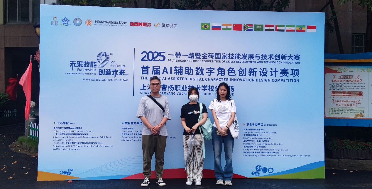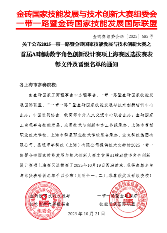 在刚刚落幕的2025一带一路暨金砖国家技能发展与技术创新大赛之首届AI辅助数字角色创新设计赛项上海赛区选拔赛中,上海电影艺术职业学院影视科创学院师生团队凭借卓越的创意和领先的AI技术应用能力,一举夺得一等奖,成功晋级全国总决赛!