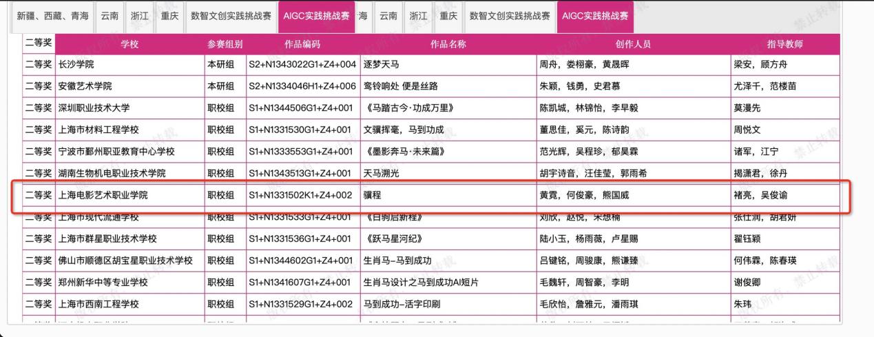 未来设计师·全国高校数字艺术设计大赛(NCDA)是入选《全国普通高校大学生竞赛排行榜》,近20家教育厅认定,“学习强国”学习平台支持,对接联合国国际赛的全国性大学生竞赛。近日,第13届未来设计师产教融合赛道AIGC实践挑战赛省级赛结果公布。我院推选的多部作品表现优异,其中学院专业师生团队作品《骥程》荣获省级二等奖,晋级全国总决赛,《光驹-印象》获省级三等奖。