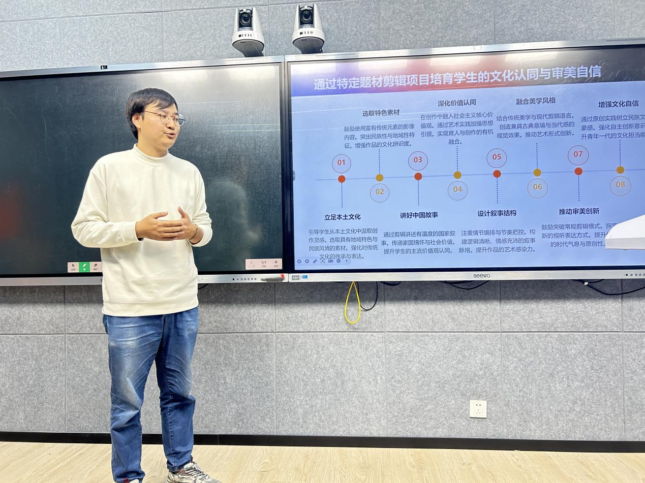 在本次说课活动中,影视多媒体专业教师盛鑫磊作为入职满一年的青年教师,进行了课程设计与教学展示。他围绕《剪辑技术》课程,从课程定位、学情分析、教学设计、课程改革展望、人工智能辅助、课程思政融入多个维度展开阐述,充分展现了其扎实的专业功底与教学潜力。