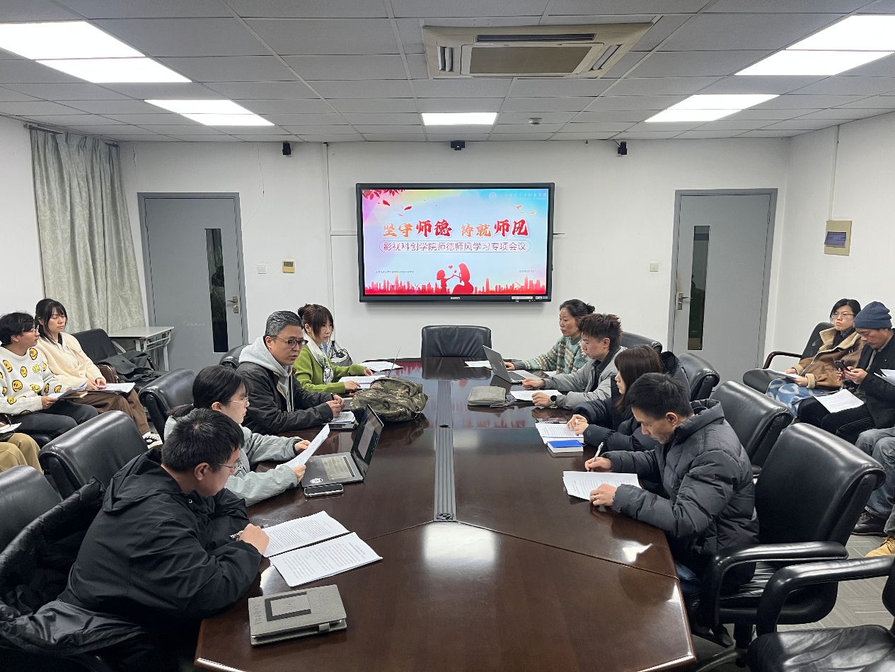 此次会议是影视科创学院加强教师队伍内涵建设的重要举措。通过对于漪老师先进事迹的学习,全体教职工在精神上得到了深度共鸣,进一步明确了“为谁培养人、培养什么人、怎样培养人”的核心问题。人事处关于政策规章的权威解读,不仅为学院老师划清了职业行为红线,也为学院日常管理与考核提供了标准依据。孙鹏书记指出,党支部将把师德建设作为基层党建的重中之重;褚亮院长则强调,良好的师风是培养高素质影视科创人才的根本保障,此次会议对于净化教学环境、提升科研诚信具有积极的推动作用。