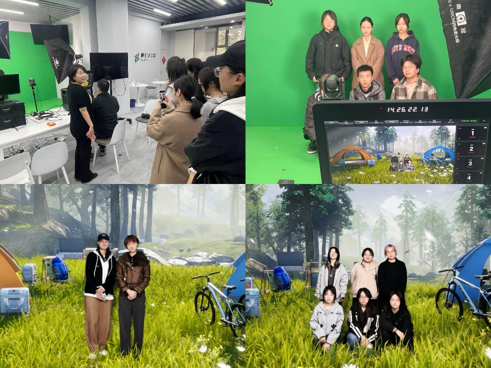 调研的尾声,师生们走进了MPRO智能绿箱演播室进行实地体验。同学们轮流站上绿幕,通过实时抠像合成技术,瞬间置身于风格各异的虚拟场景中,亲身感受了虚拟拍摄的沉浸式魅力,并在虚拟背景前合影留念,为此次走访留下了生动的注脚。